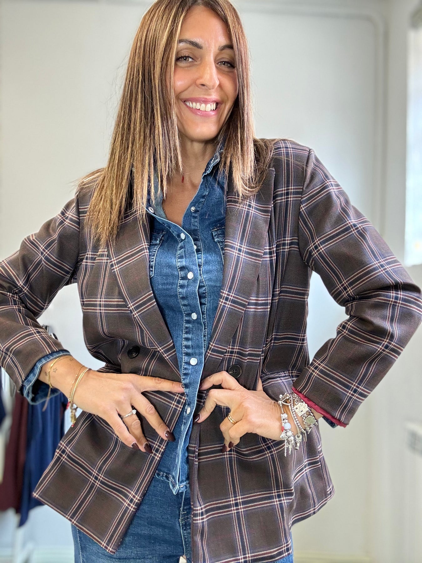 Un blazer dal sapore decisamente autunnale, capace di incarnare tutti i colori di questa stagione dal marrone blu al rosso al panna, passando per il bordo.un taglio leggermente over, taglia unica, veste fino a taglia 46.