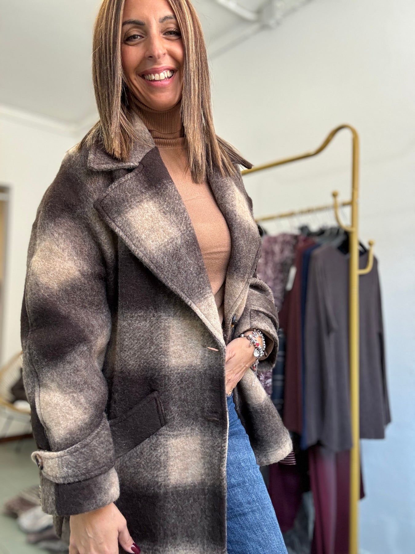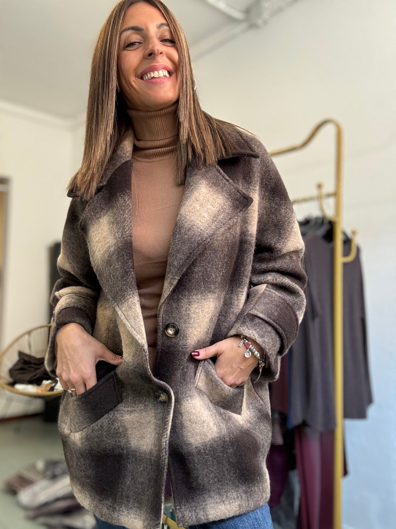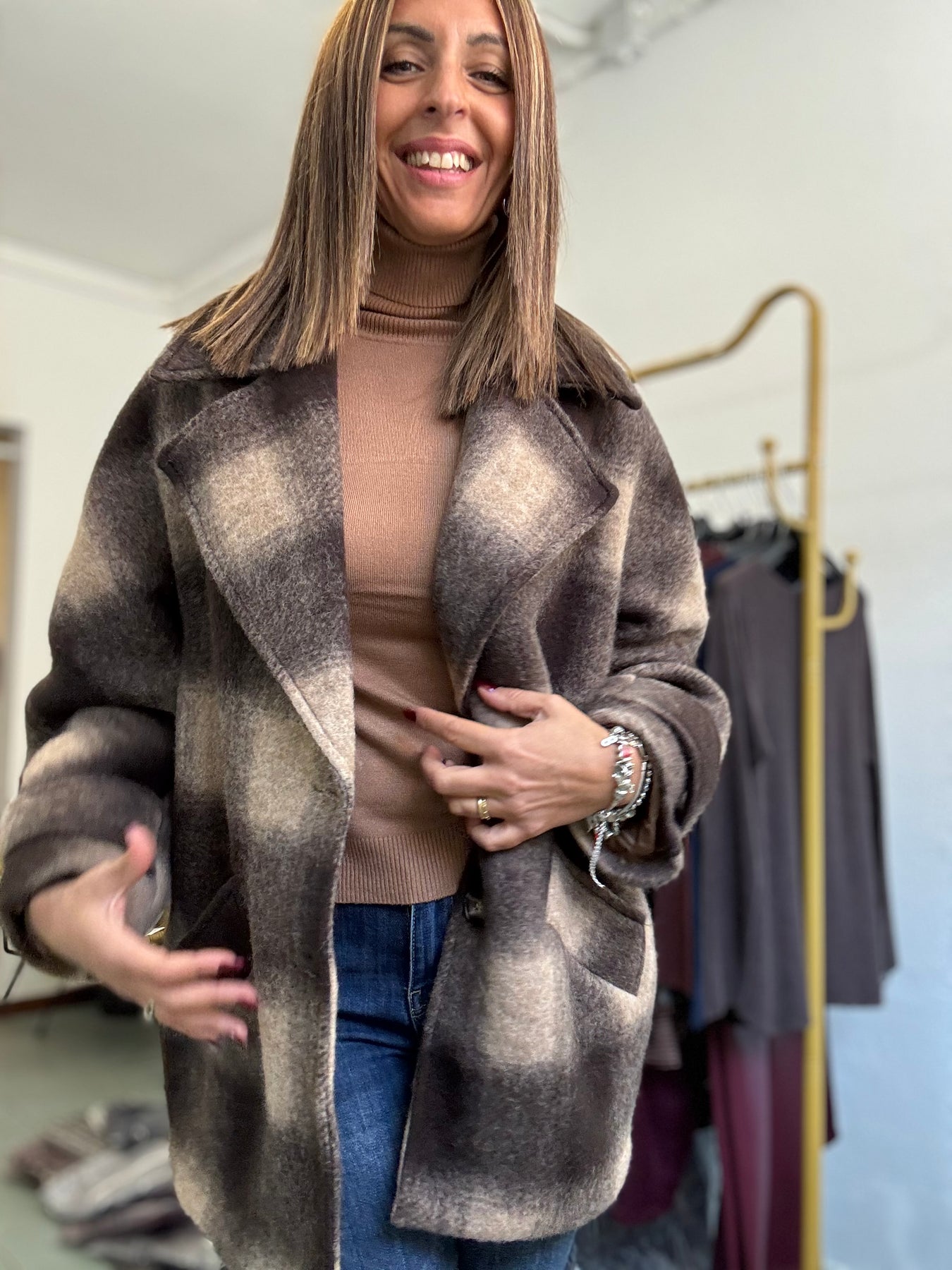 Cappotto foderato chiusura due bottoni , forma morbida leggente ad uovo. Veste fino a taglia 46.
