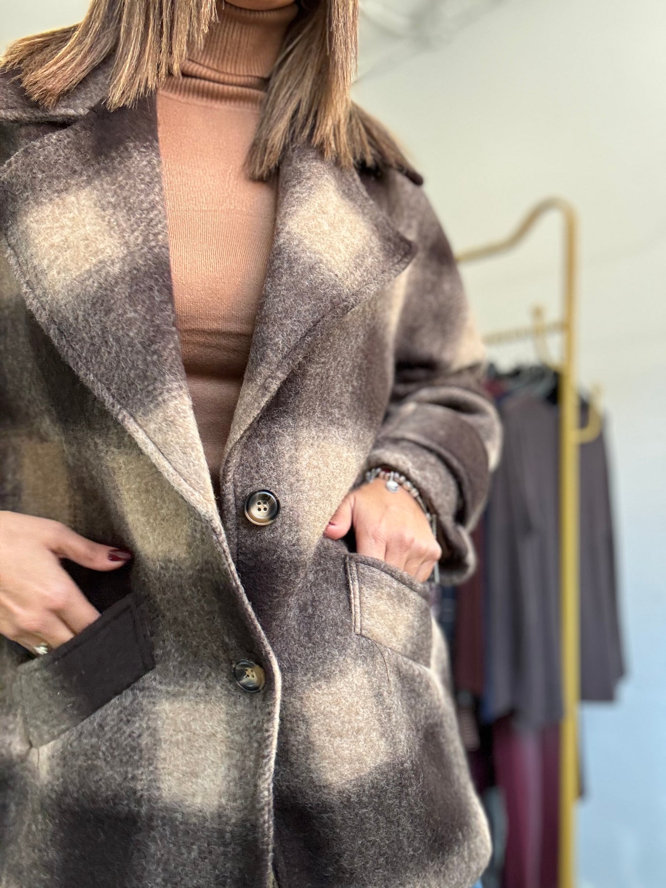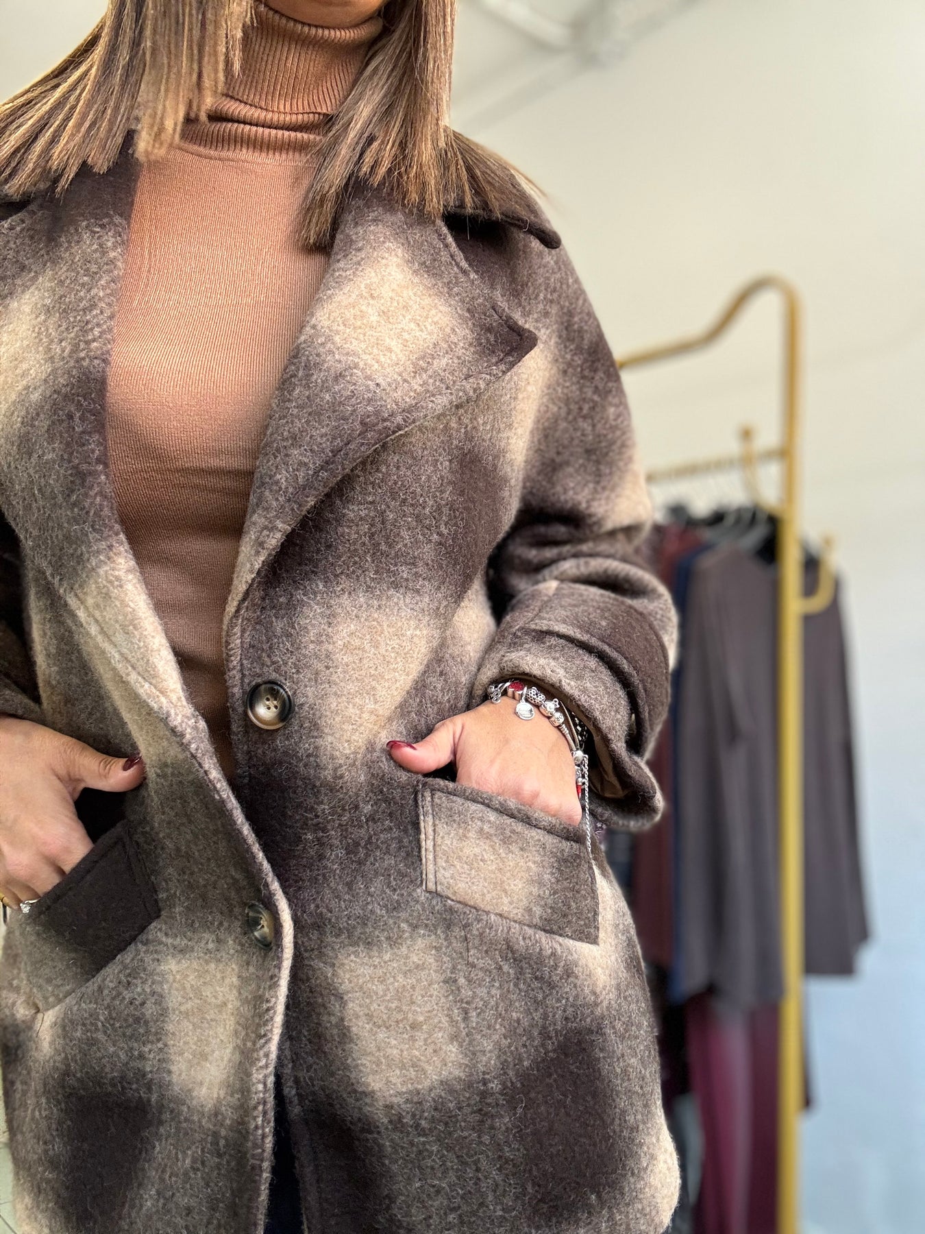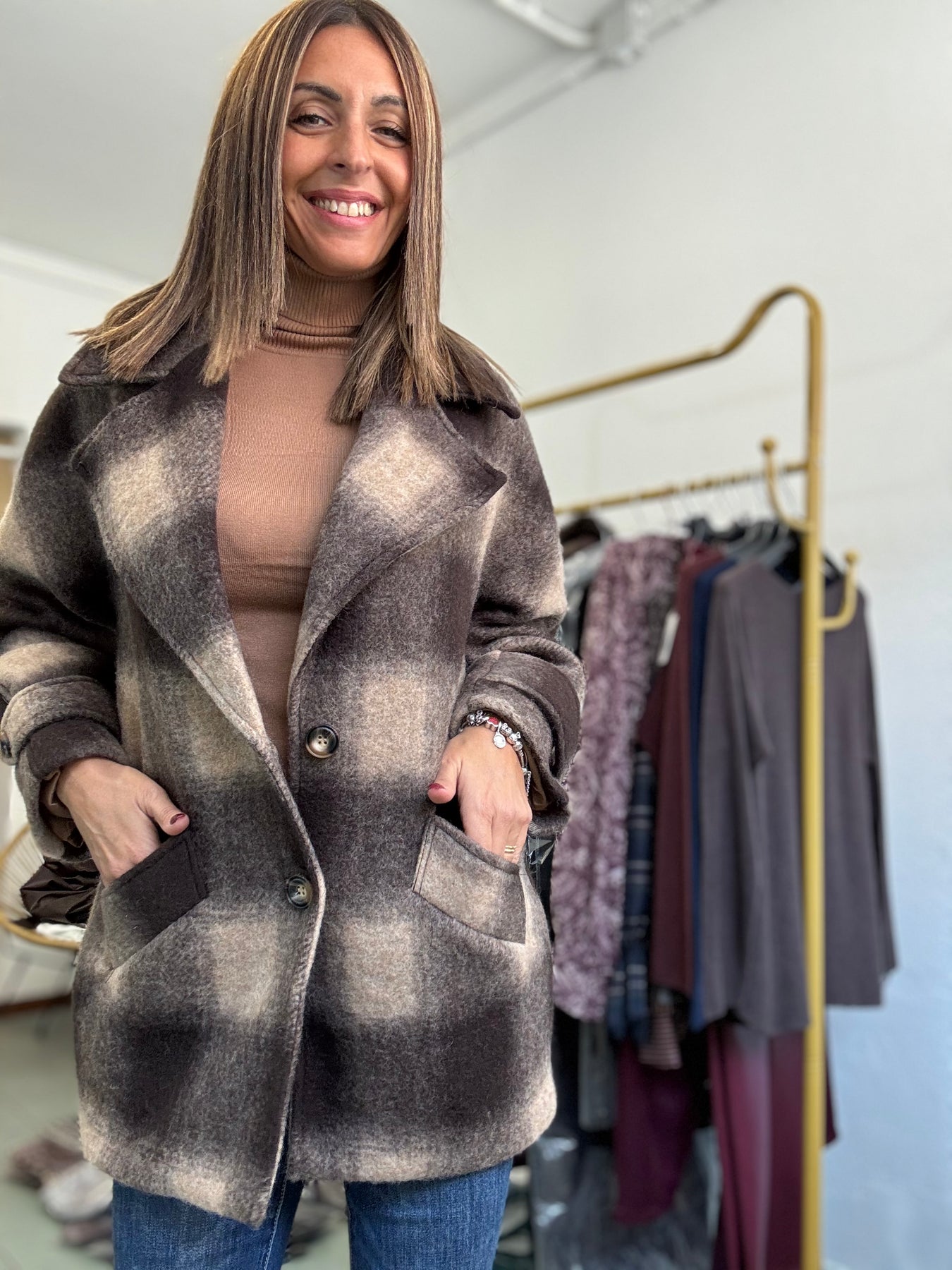 Cappotto foderato chiusura due bottoni , forma morbida leggente ad uovo. Veste fino a taglia 46.