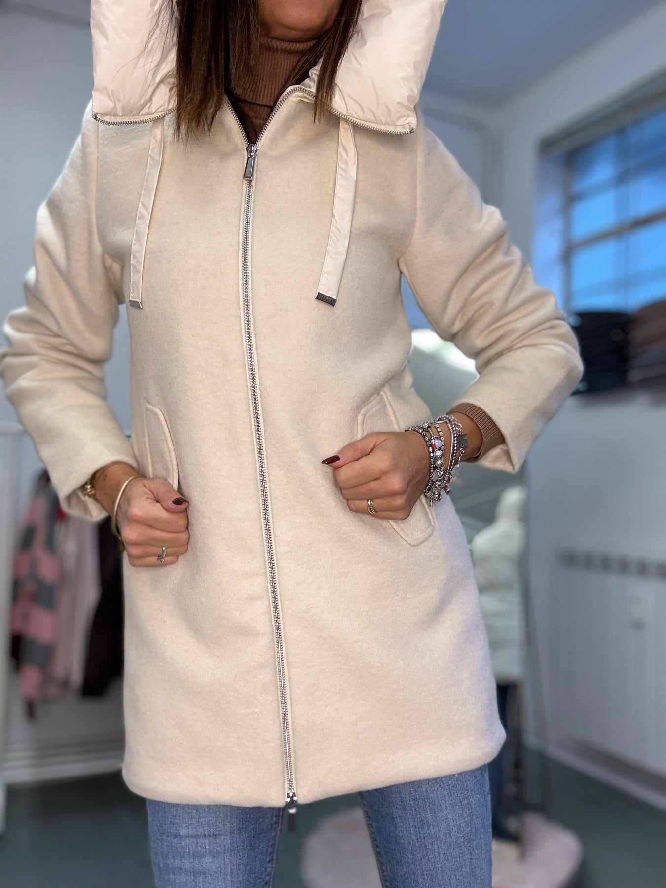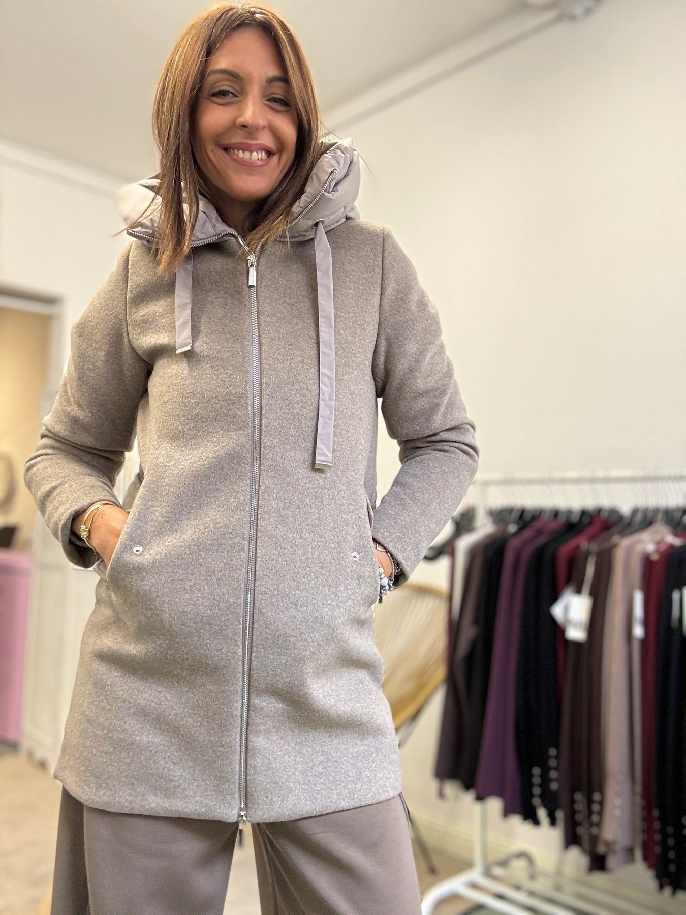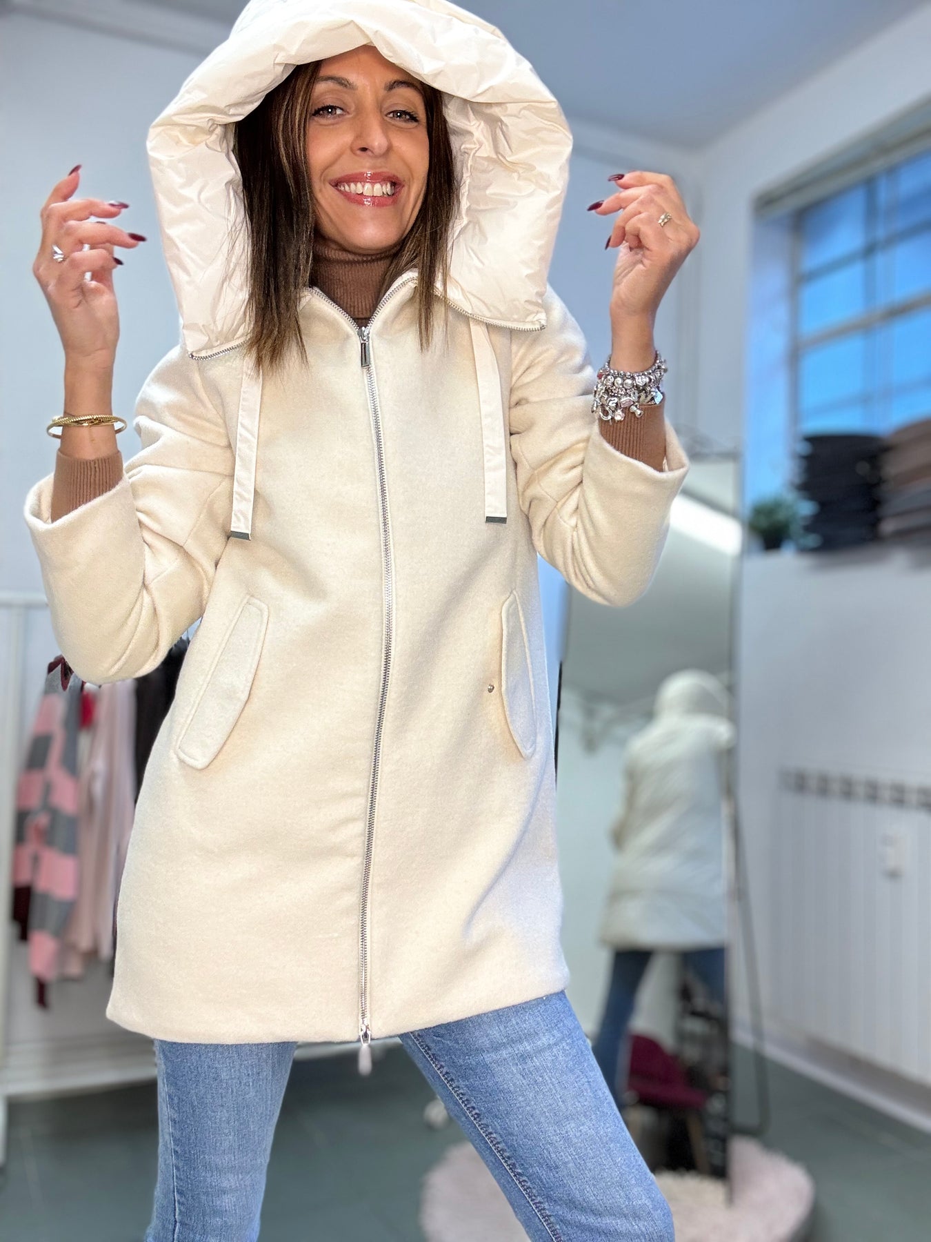 Da una parte cappotto e internamente piumino , così come posteriormente, ha il cappuccio in piumino. Due zip , ha una vestibilita regolare e morbida. La modella indossa una taglia S .