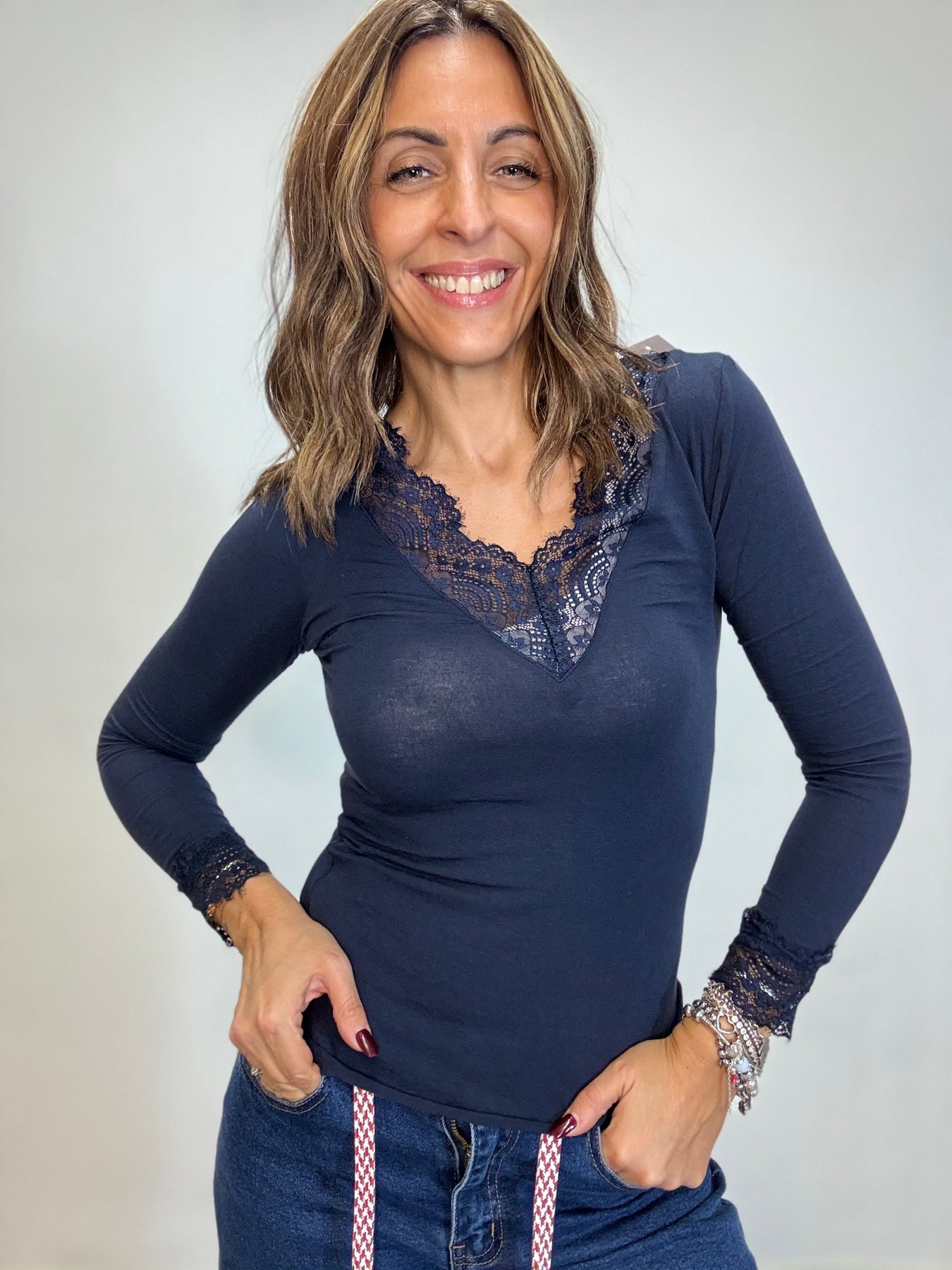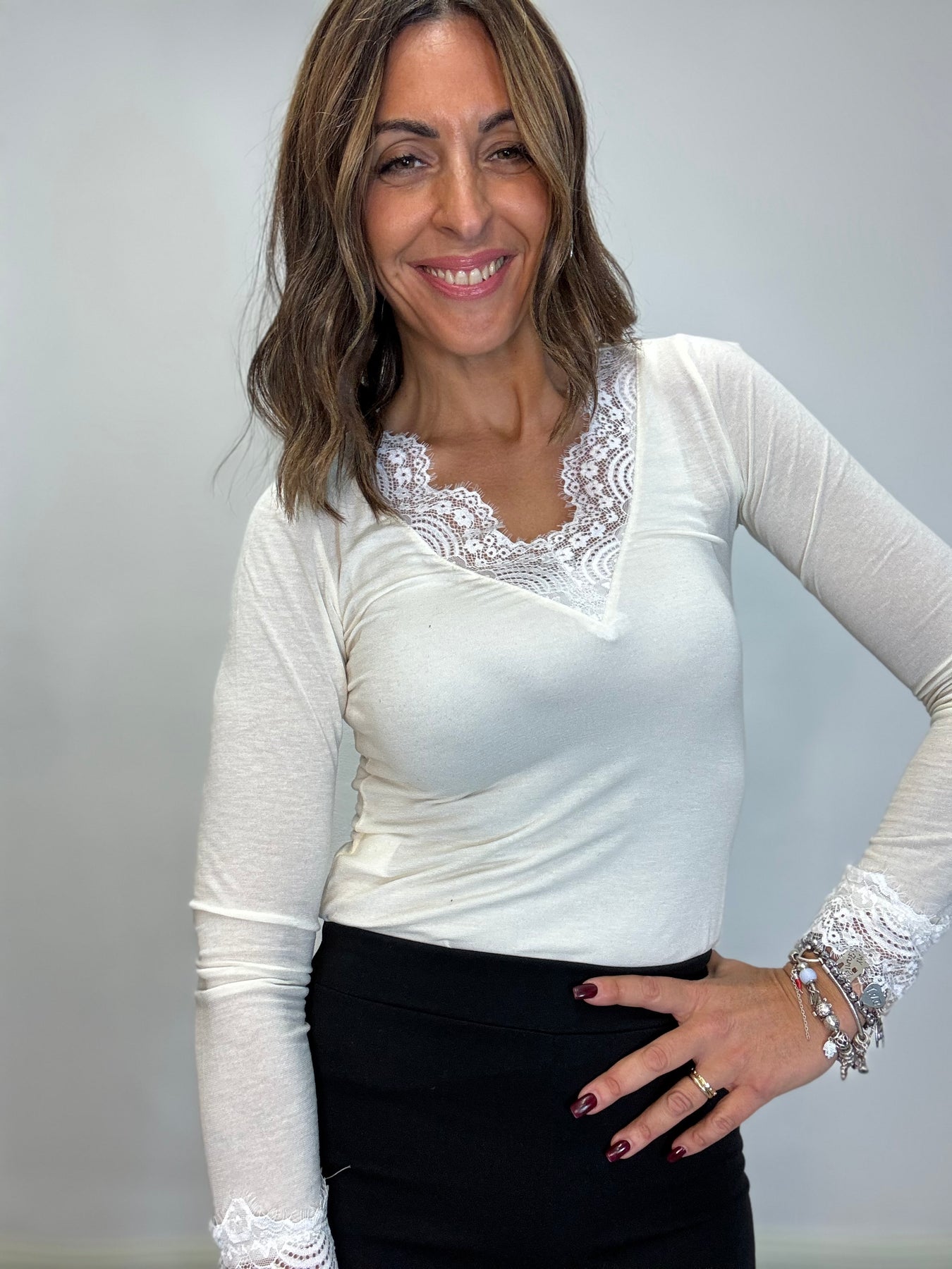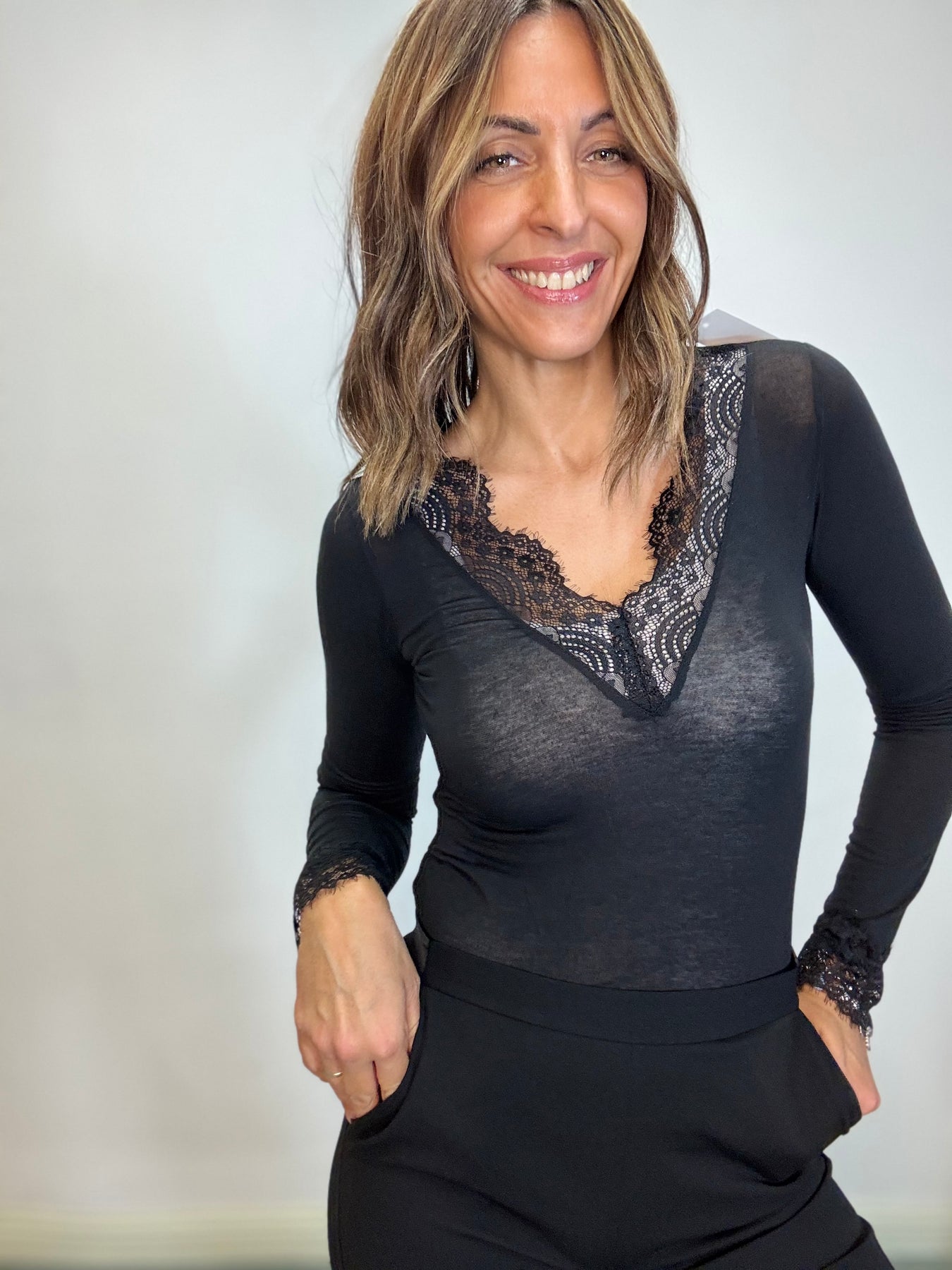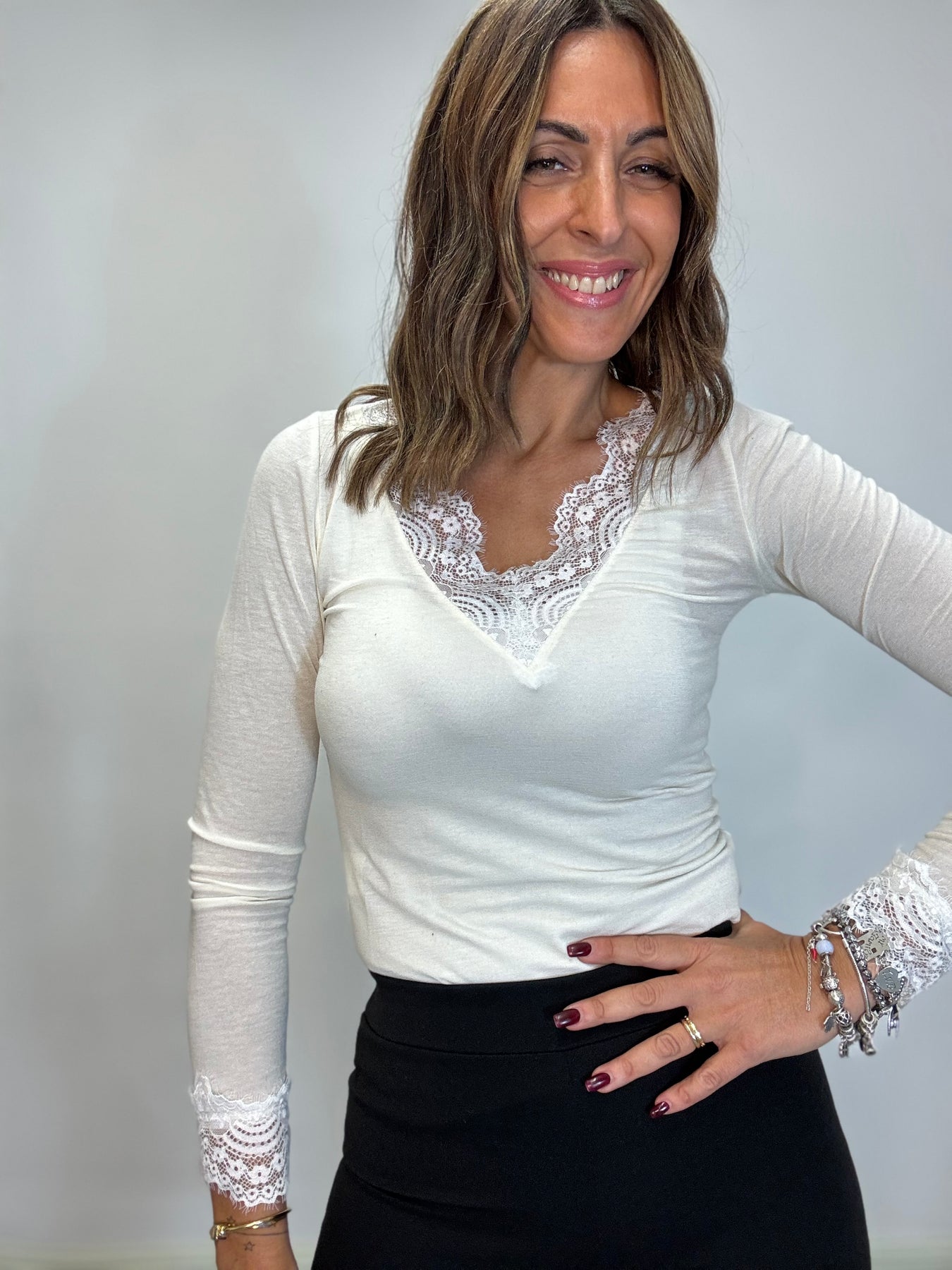 Maglia leggera in viscosa e cachemire con pizzo sullo scollo . Taglia unica , veste fino alla 44/46