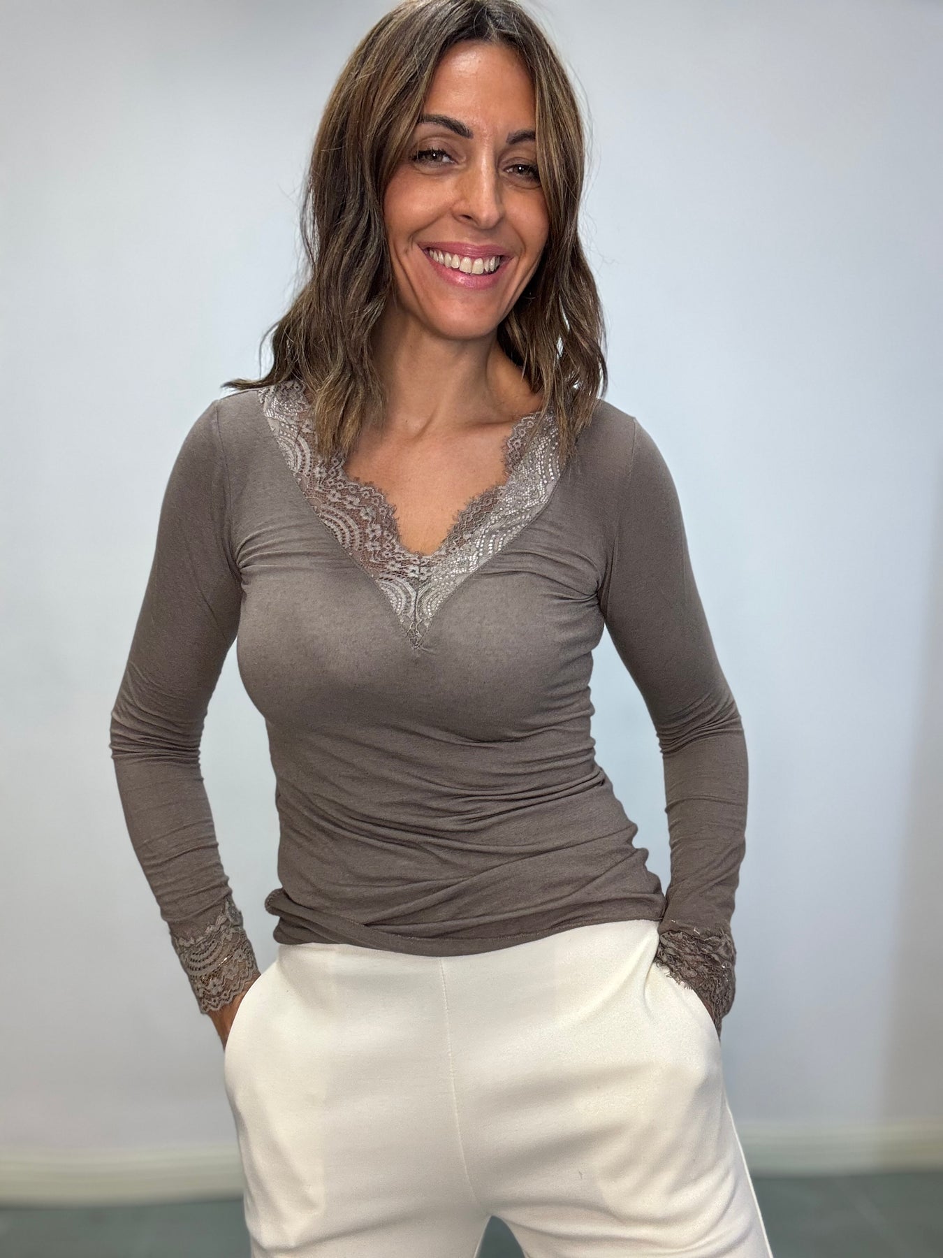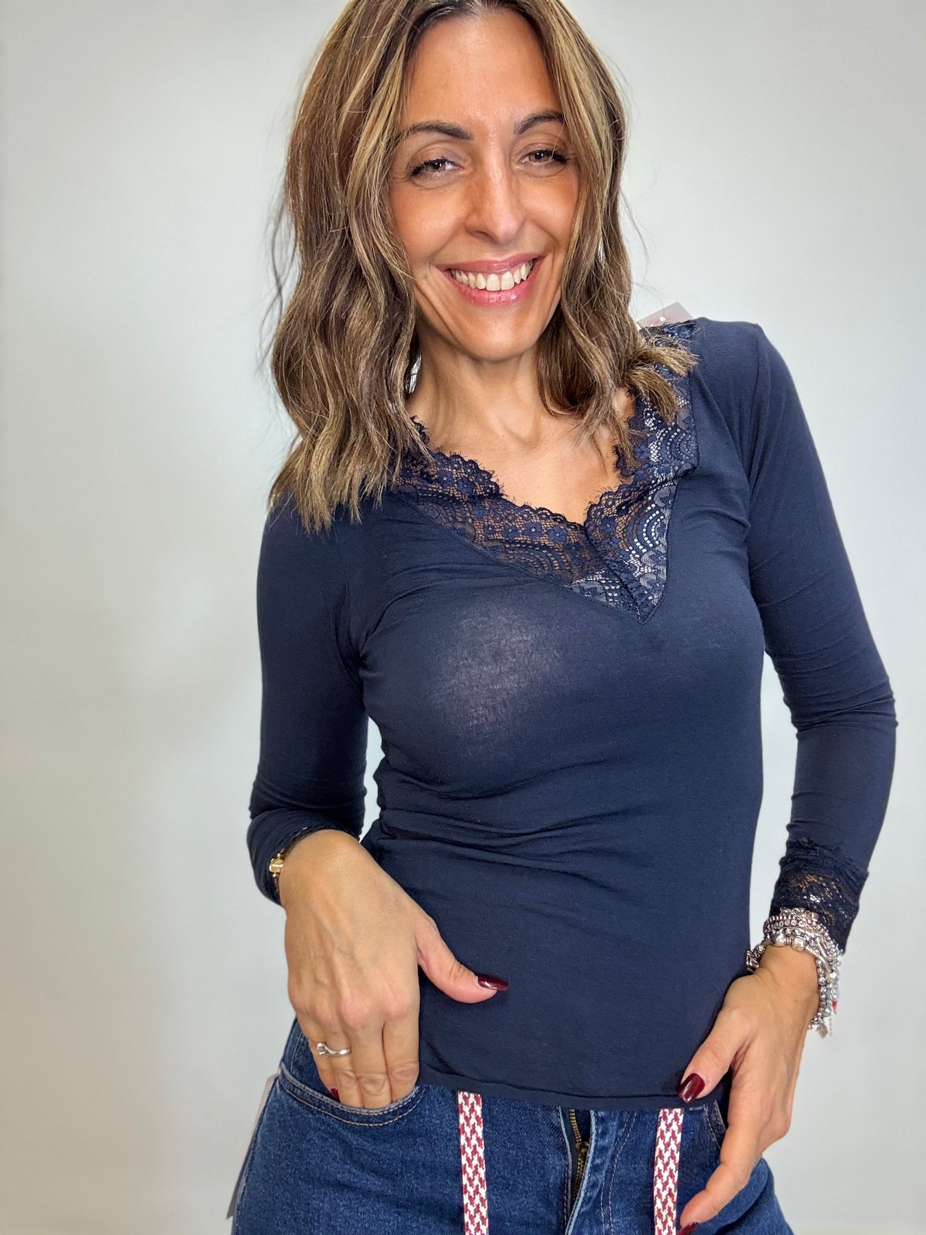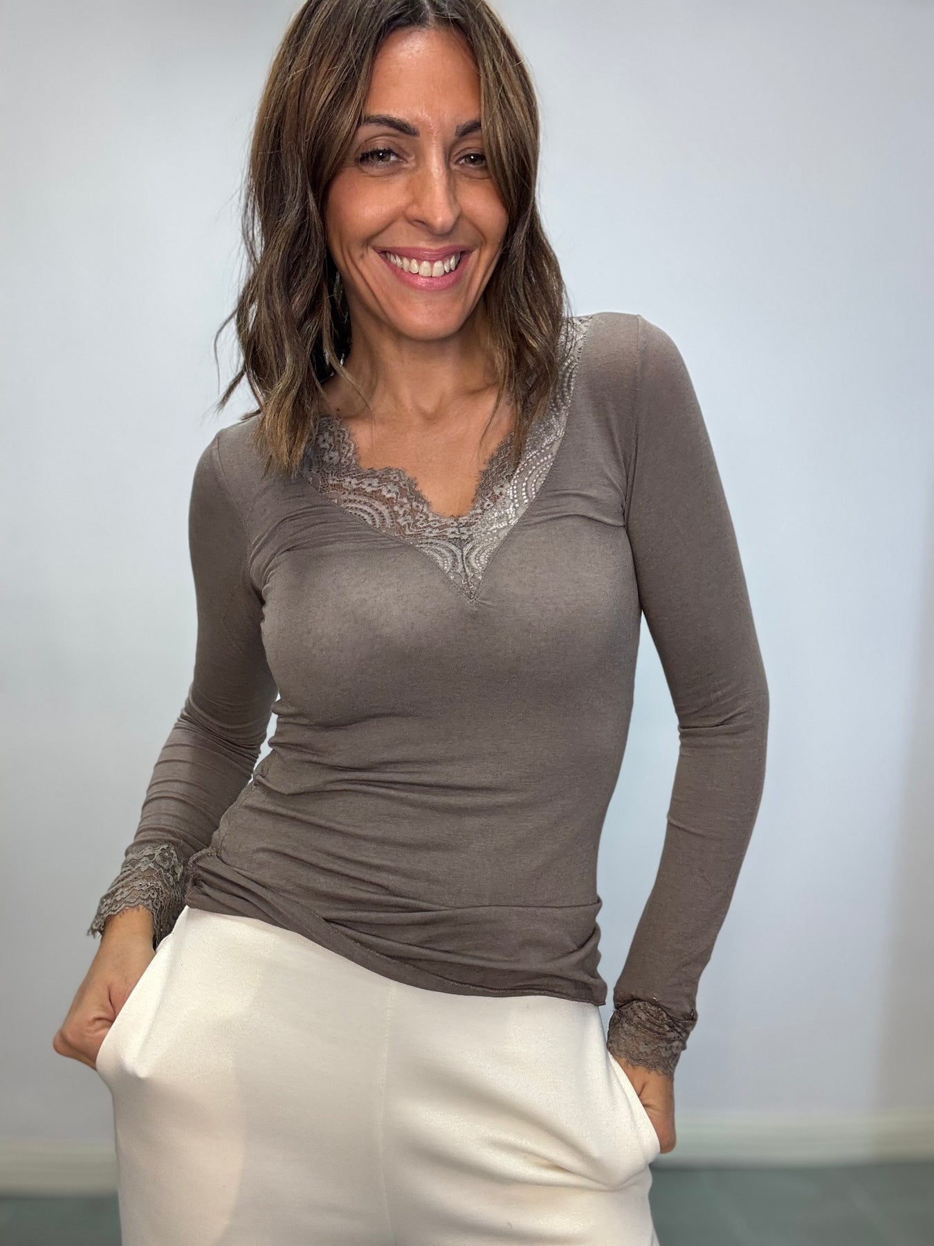 Maglia leggera in viscosa e cachemire con pizzo sullo scollo . Taglia unica , veste fino alla 44/46