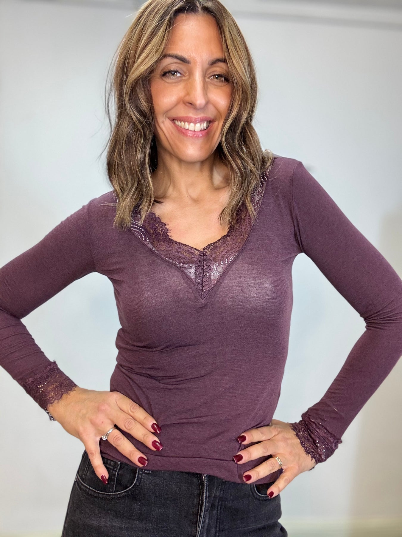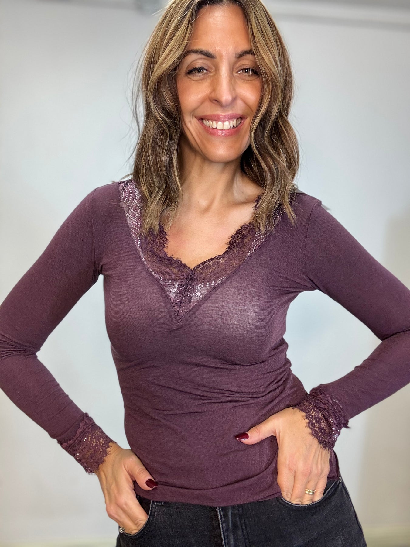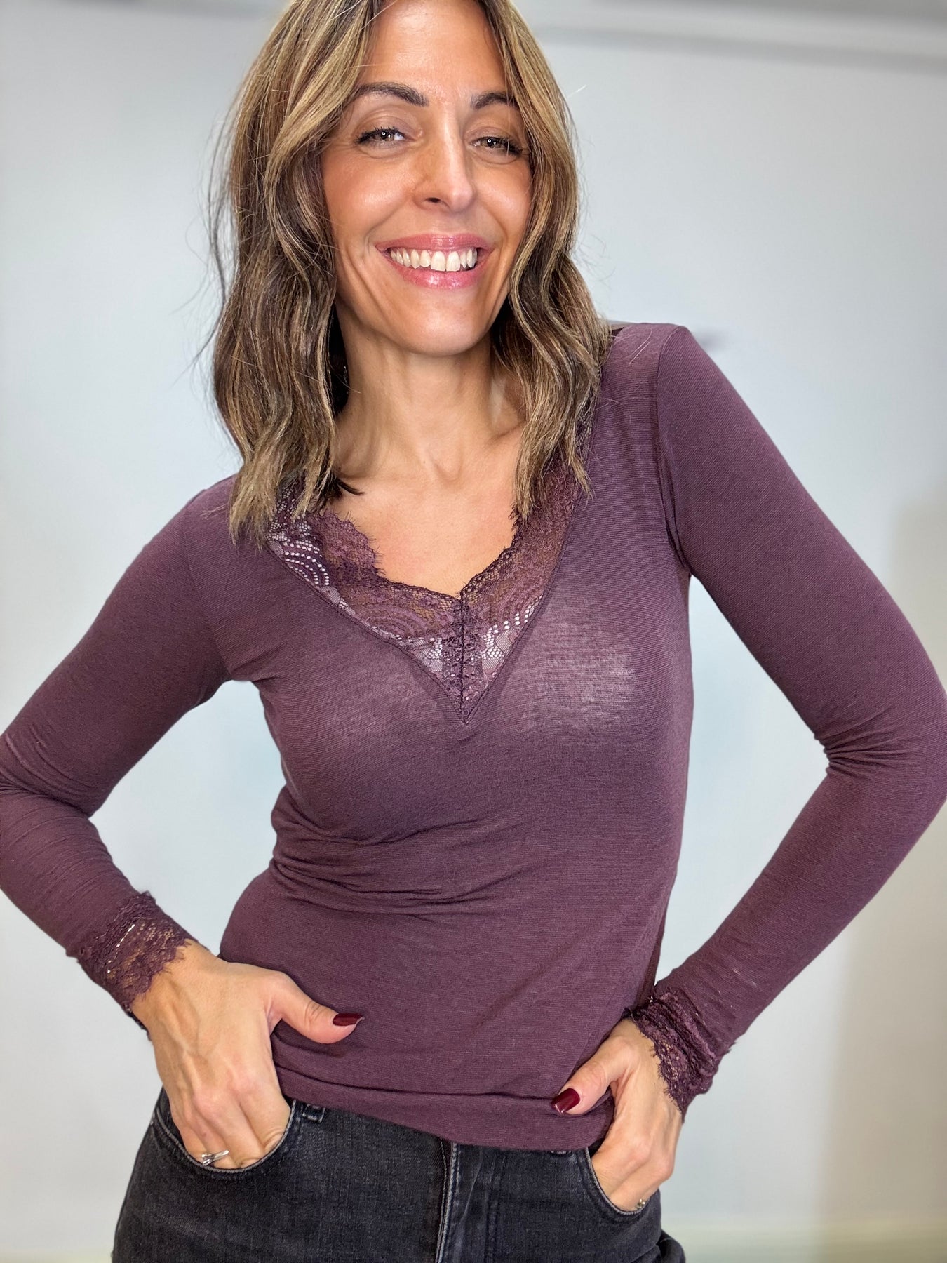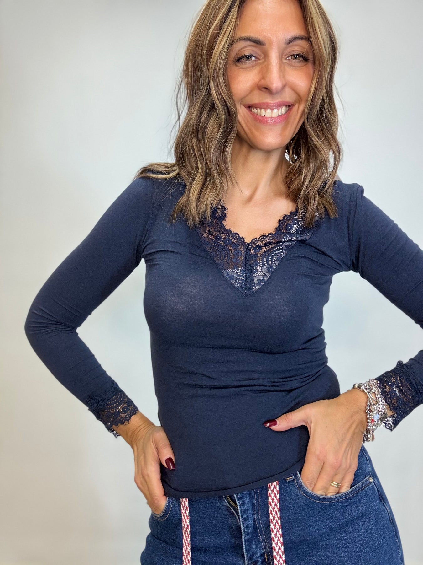 Maglia leggera in viscosa e cachemire con pizzo sullo scollo . Taglia unica , veste fino alla 44/46