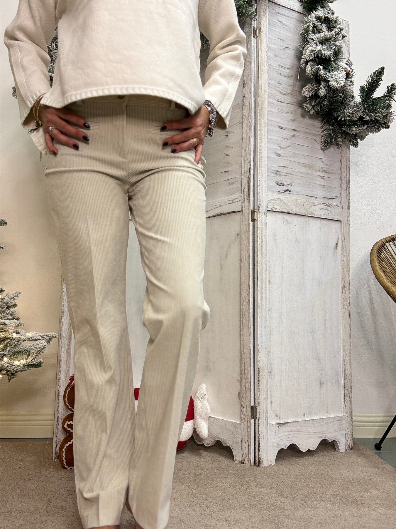 Forma leggermente a zampetta per questo pantalone con bottone in vita e lasche laterali. veste regolare . Segue la forma della gamba senza stringere eccessivamente. la modella è alta 1.74 e veste la S .