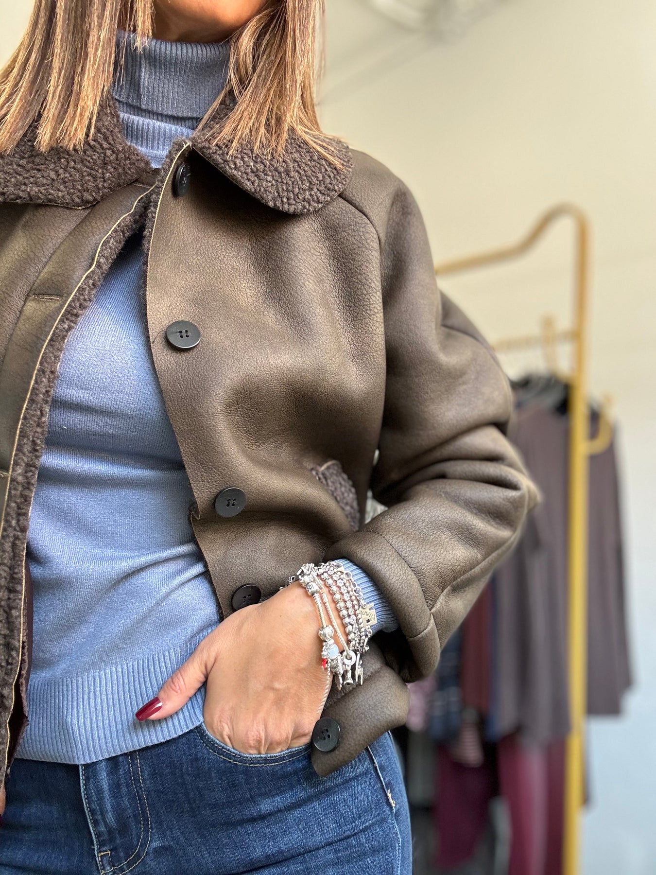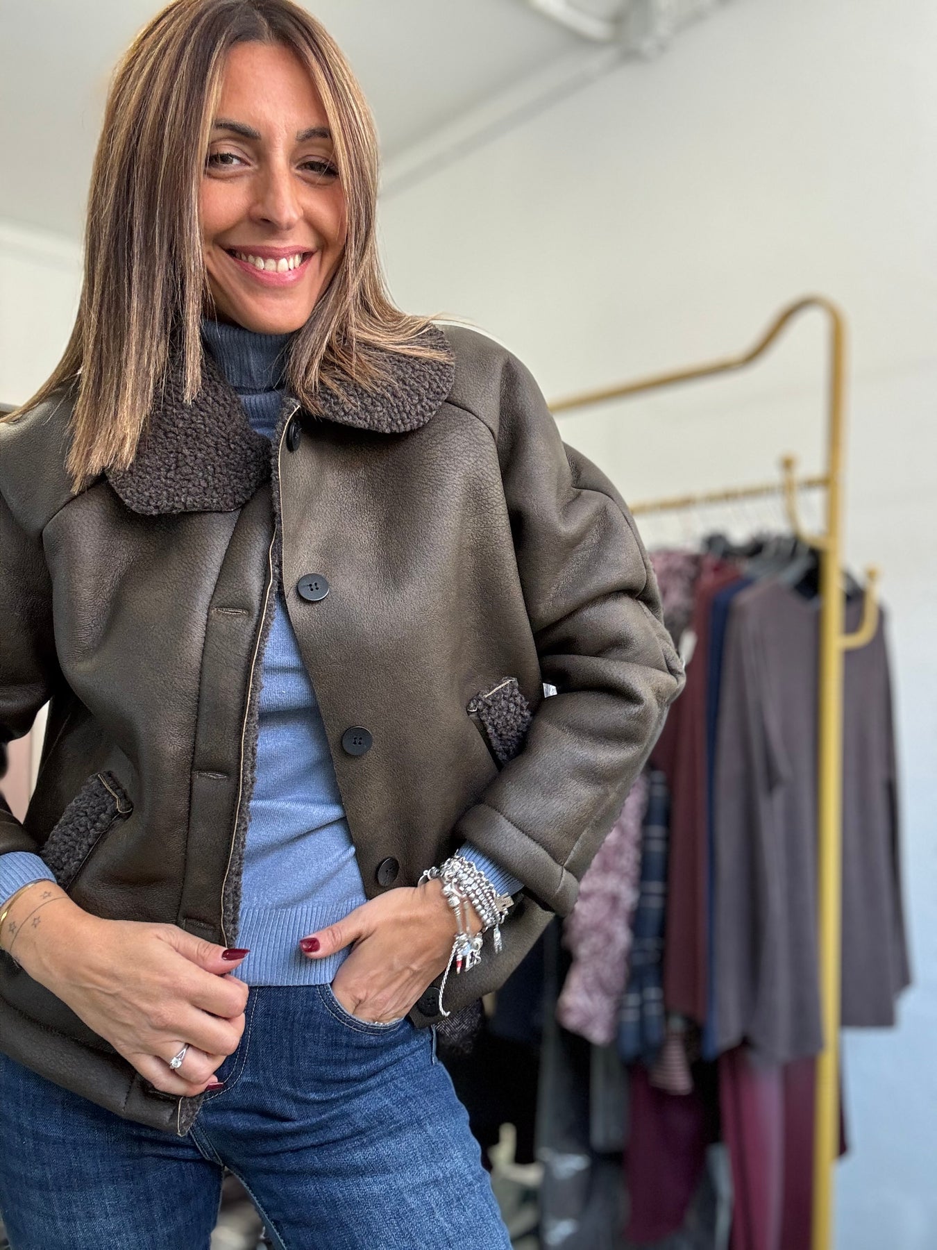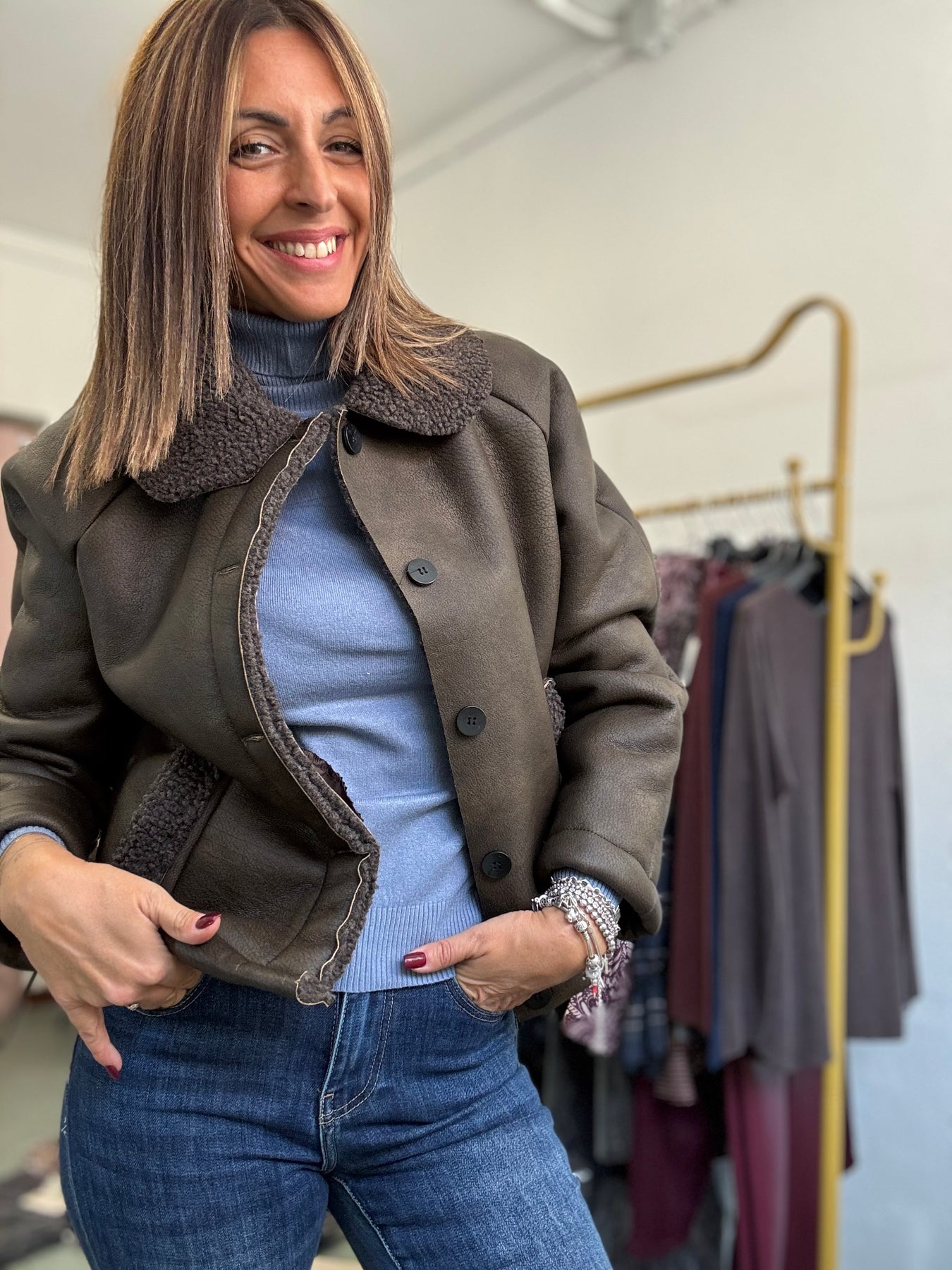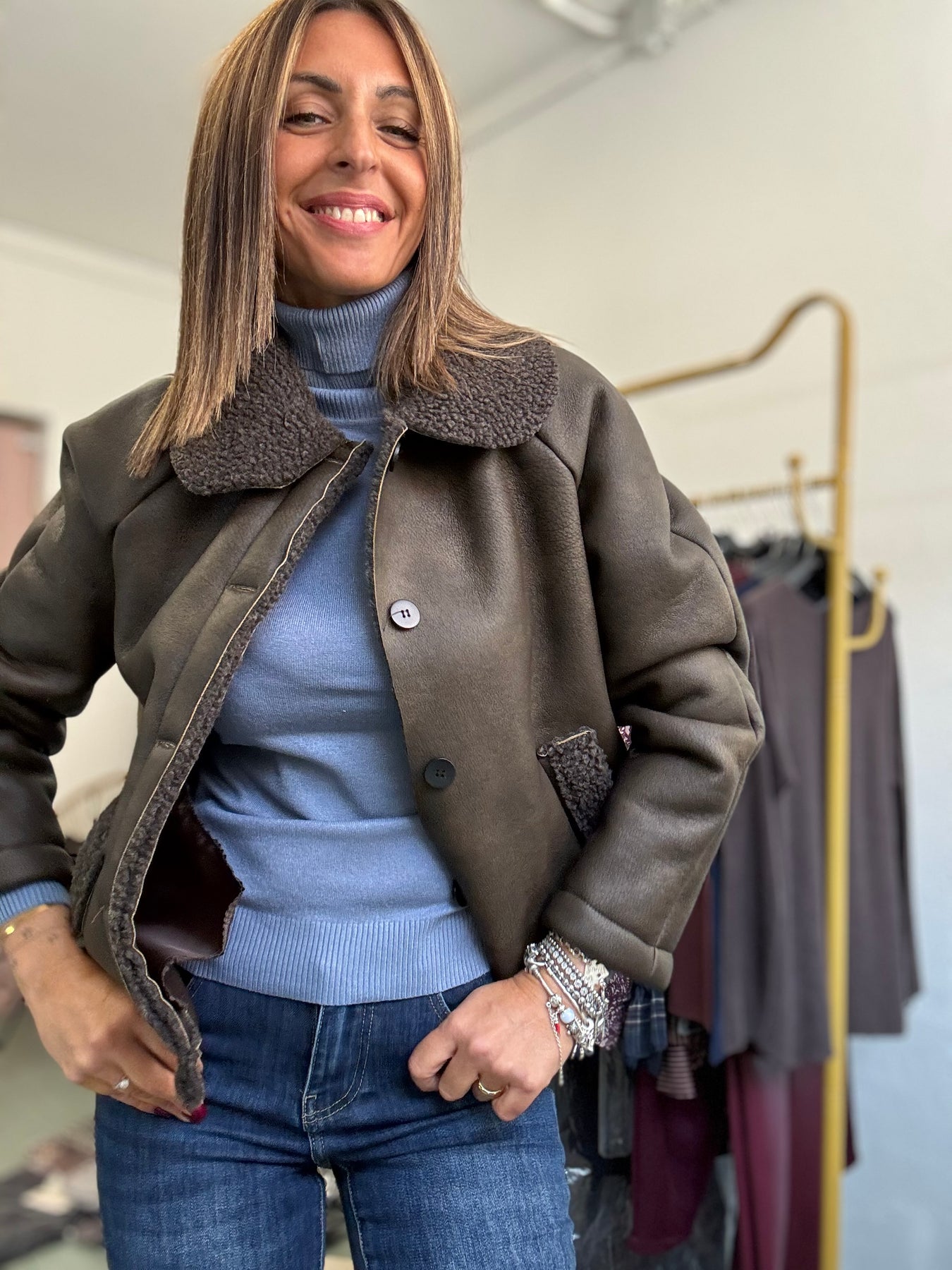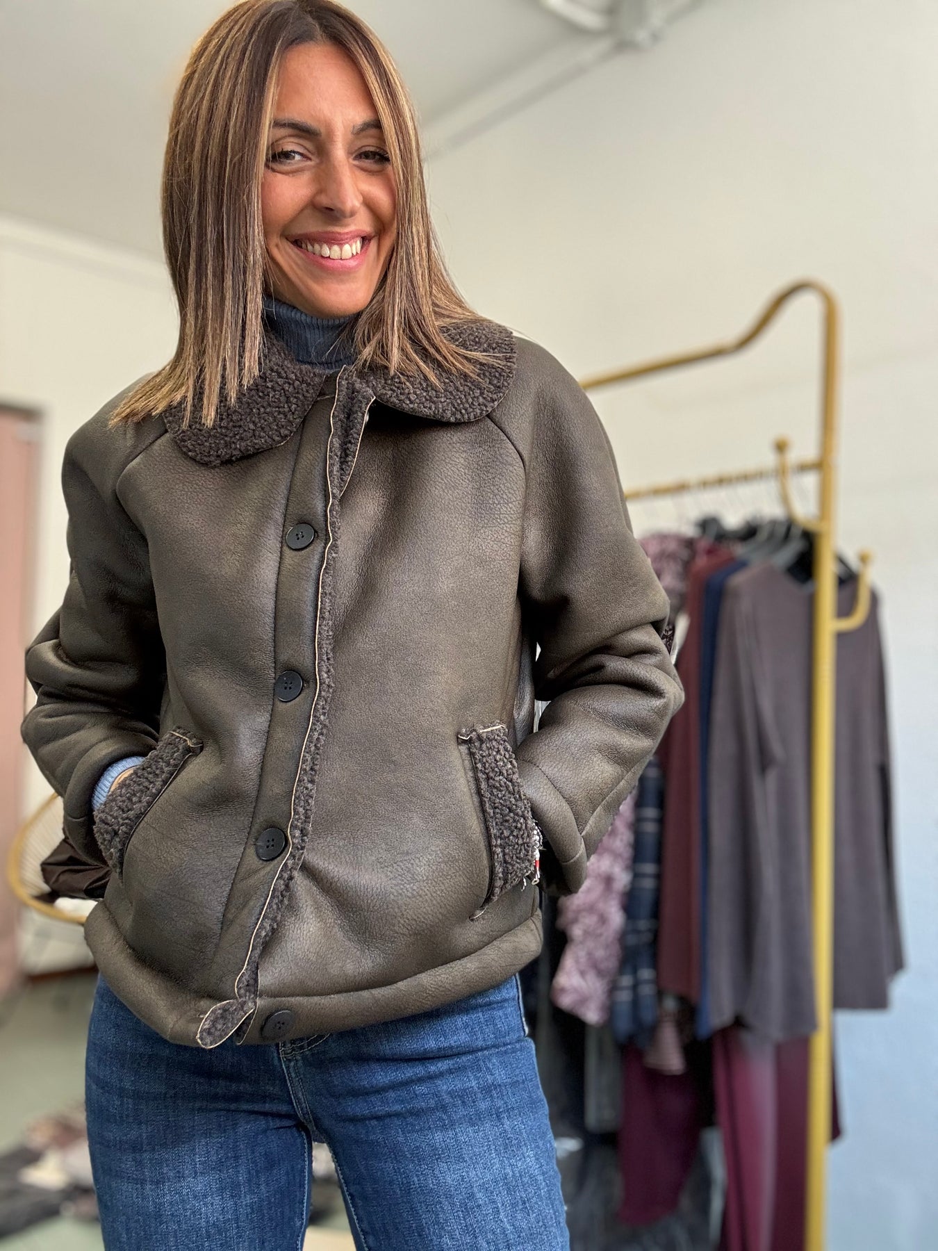 Montoncino con bottoni , taglio dritto col collo. Taglia unica , veste fino a taglia 44.