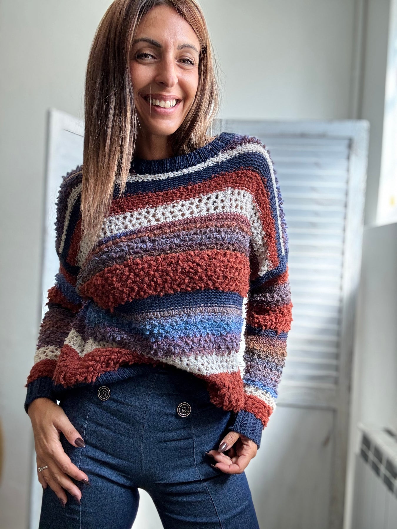 Pool bicolore girocollo in boucle , un tessuto morbidissimo che tiene caldo senza pungere, molto abbinabile a tutti i colori di questa stagione. Taglia unica veste fino alla taglia 44/46