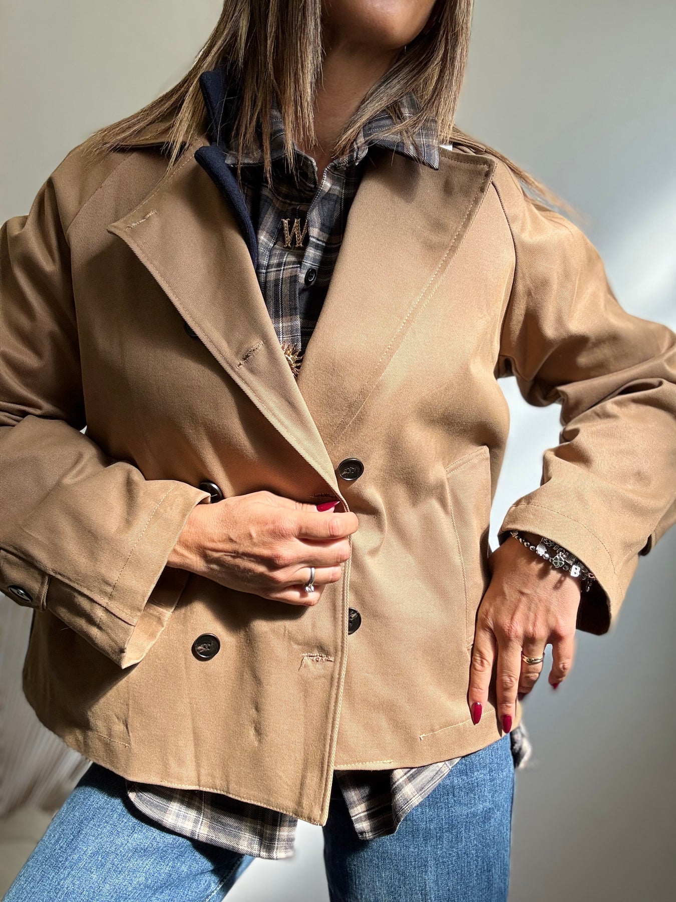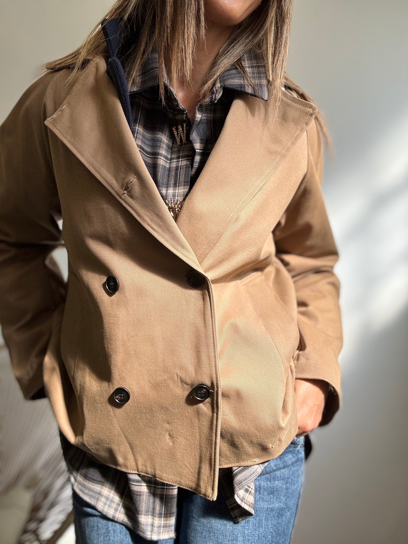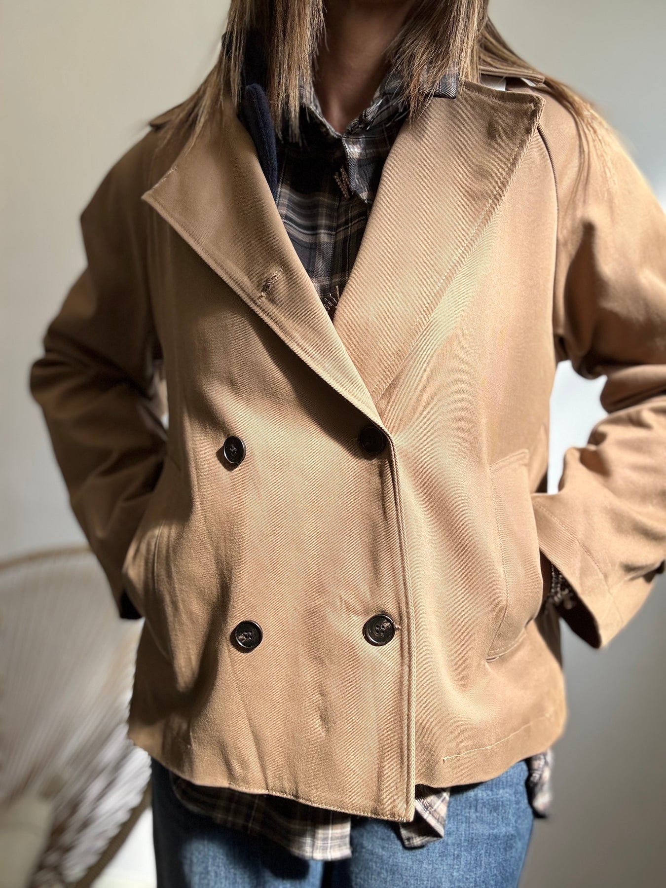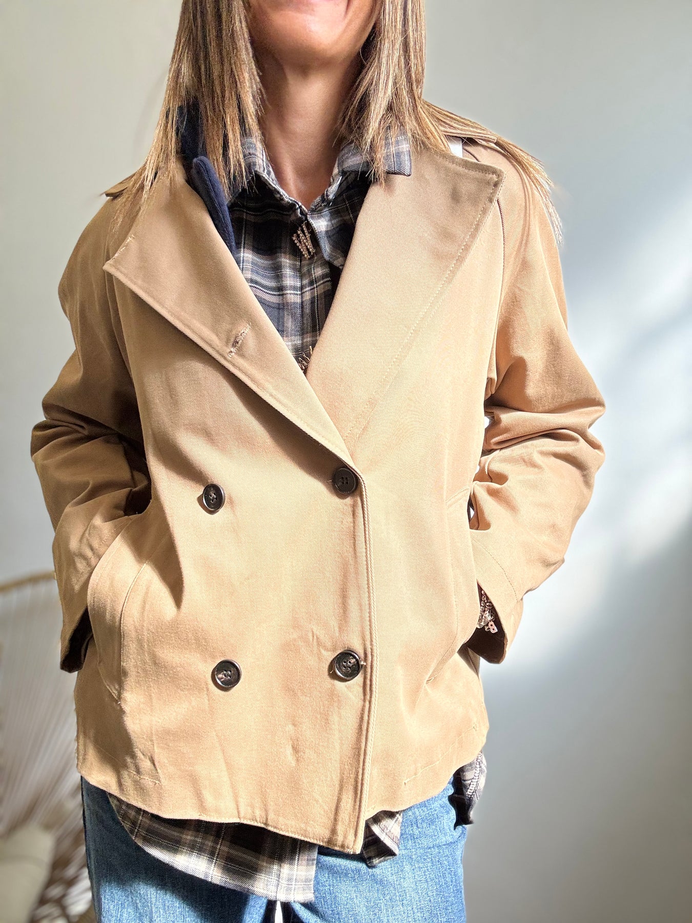 Tranch corto tradizionale, chiusura doppiopetto . Taglia unica veste fino a taglia 44/46.