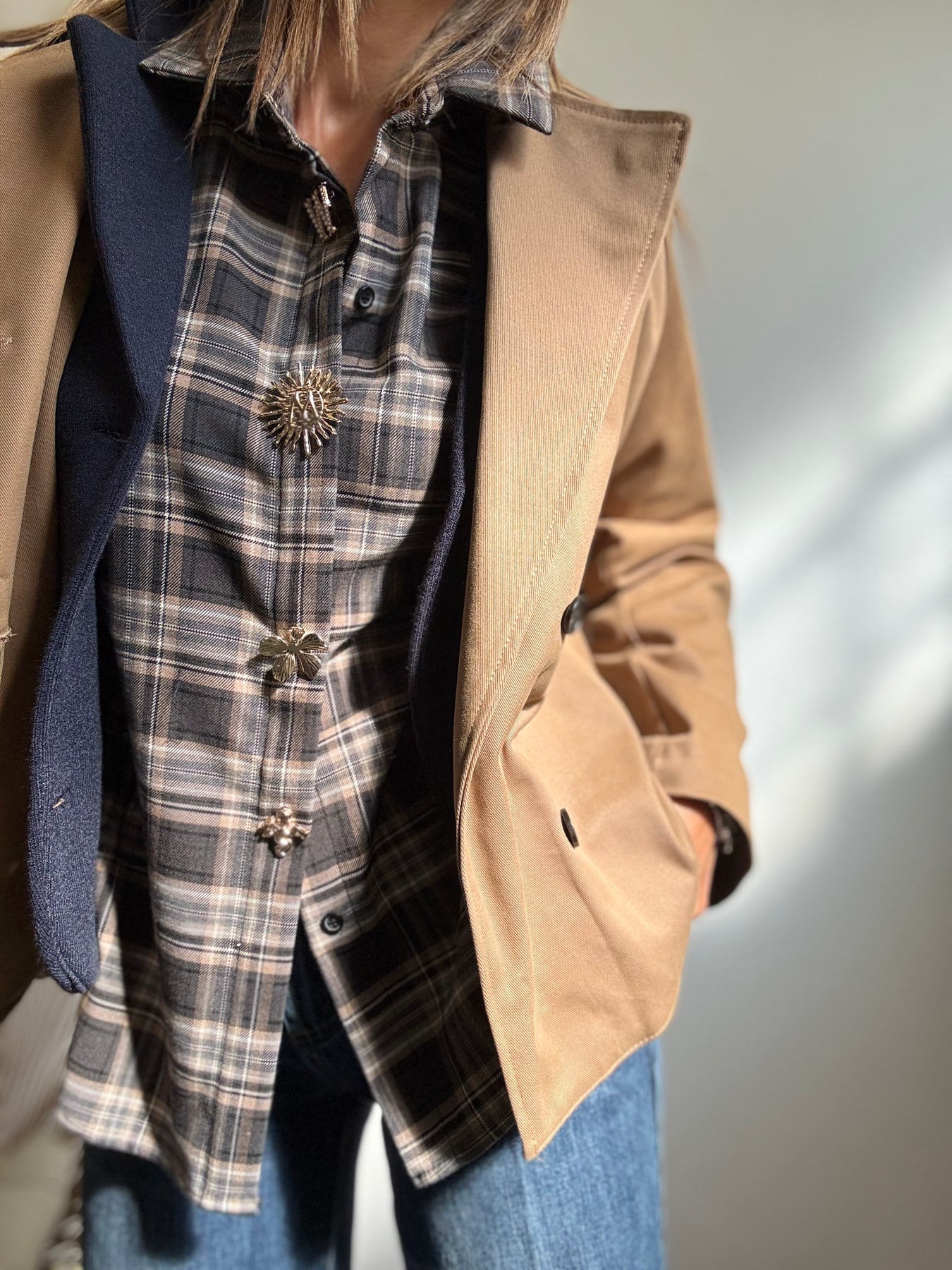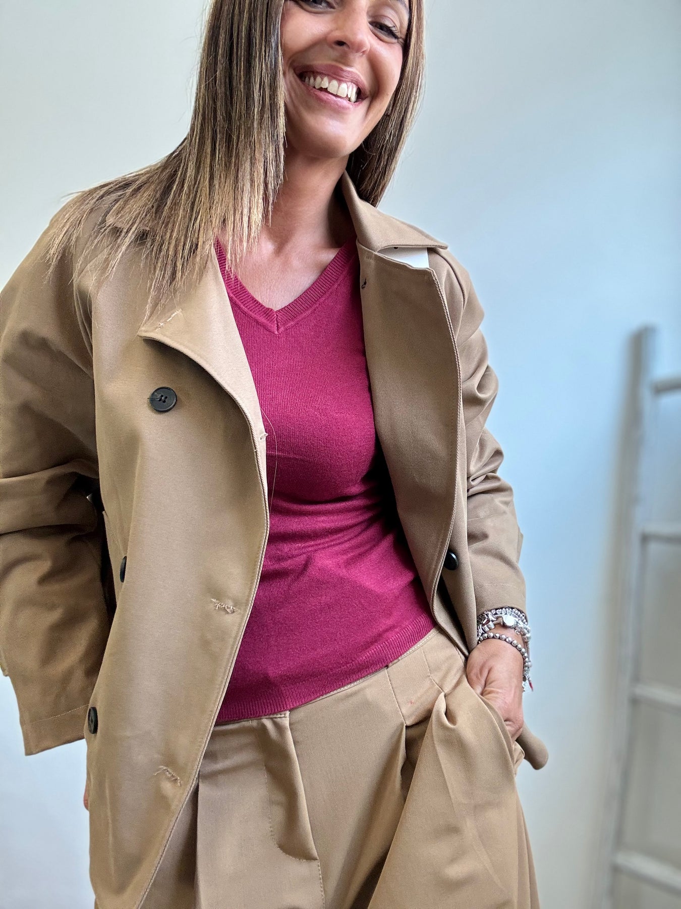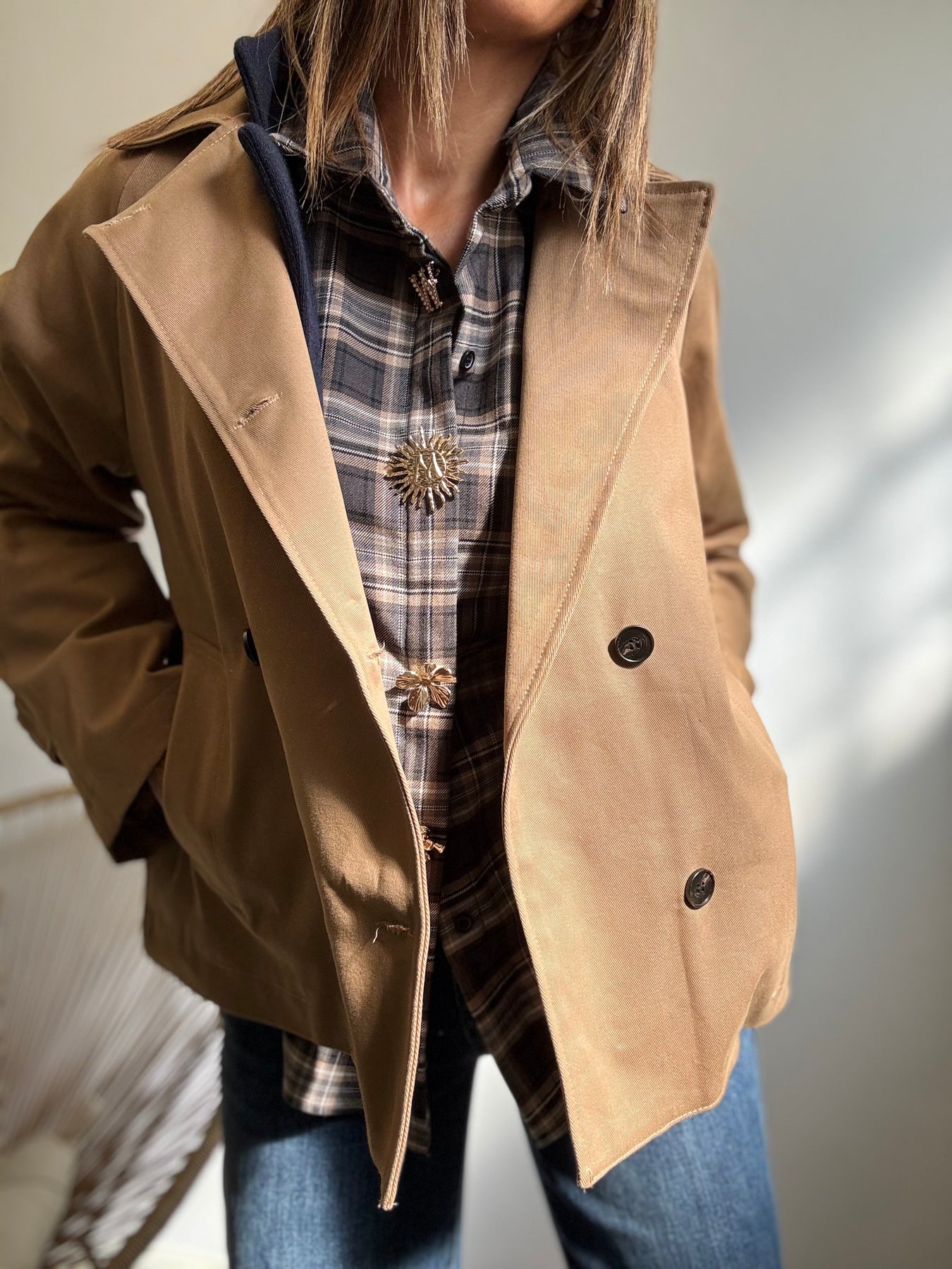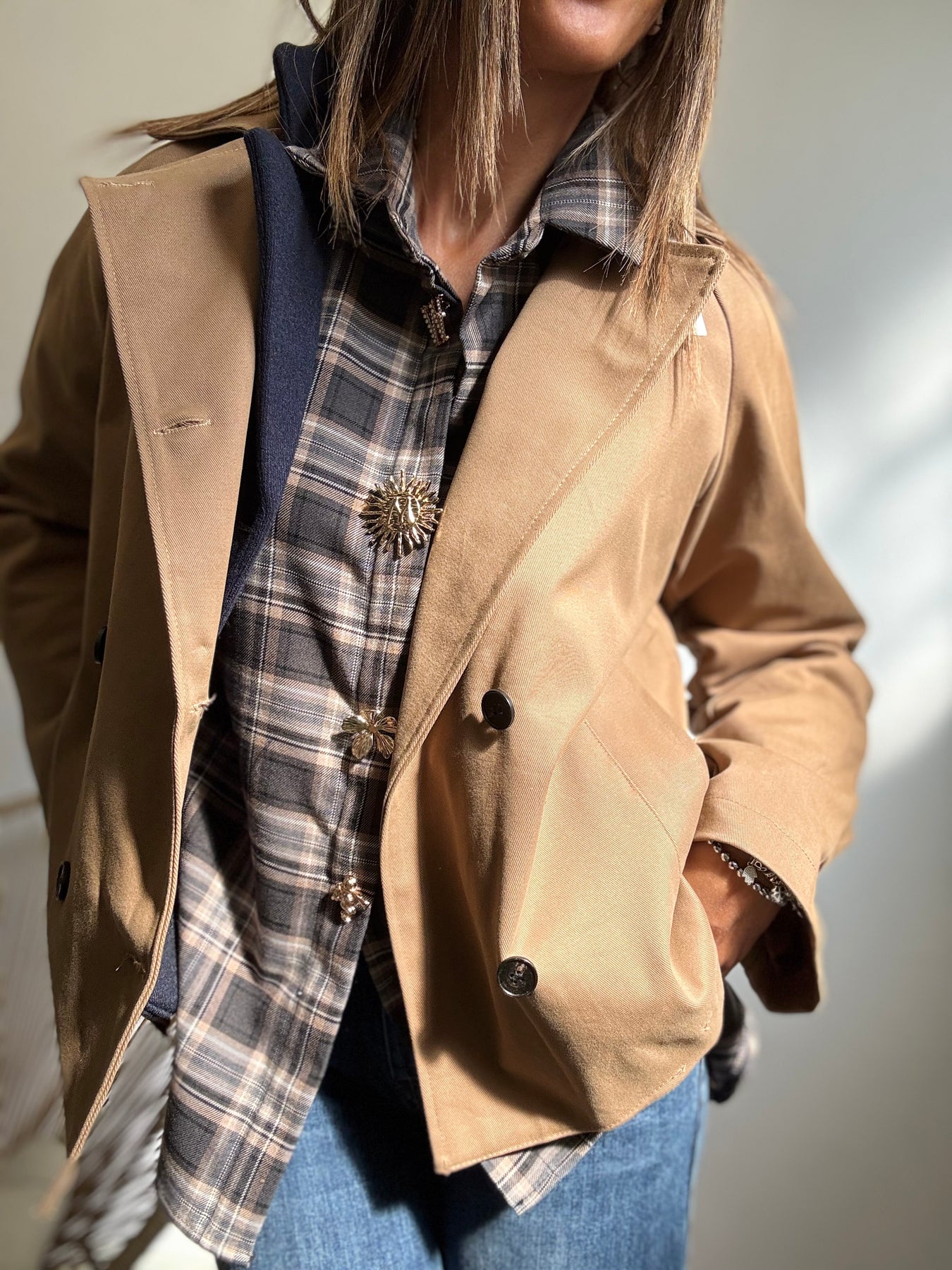 Tranch corto tradizionale, chiusura doppiopetto . Taglia unica veste fino a taglia 44/46.