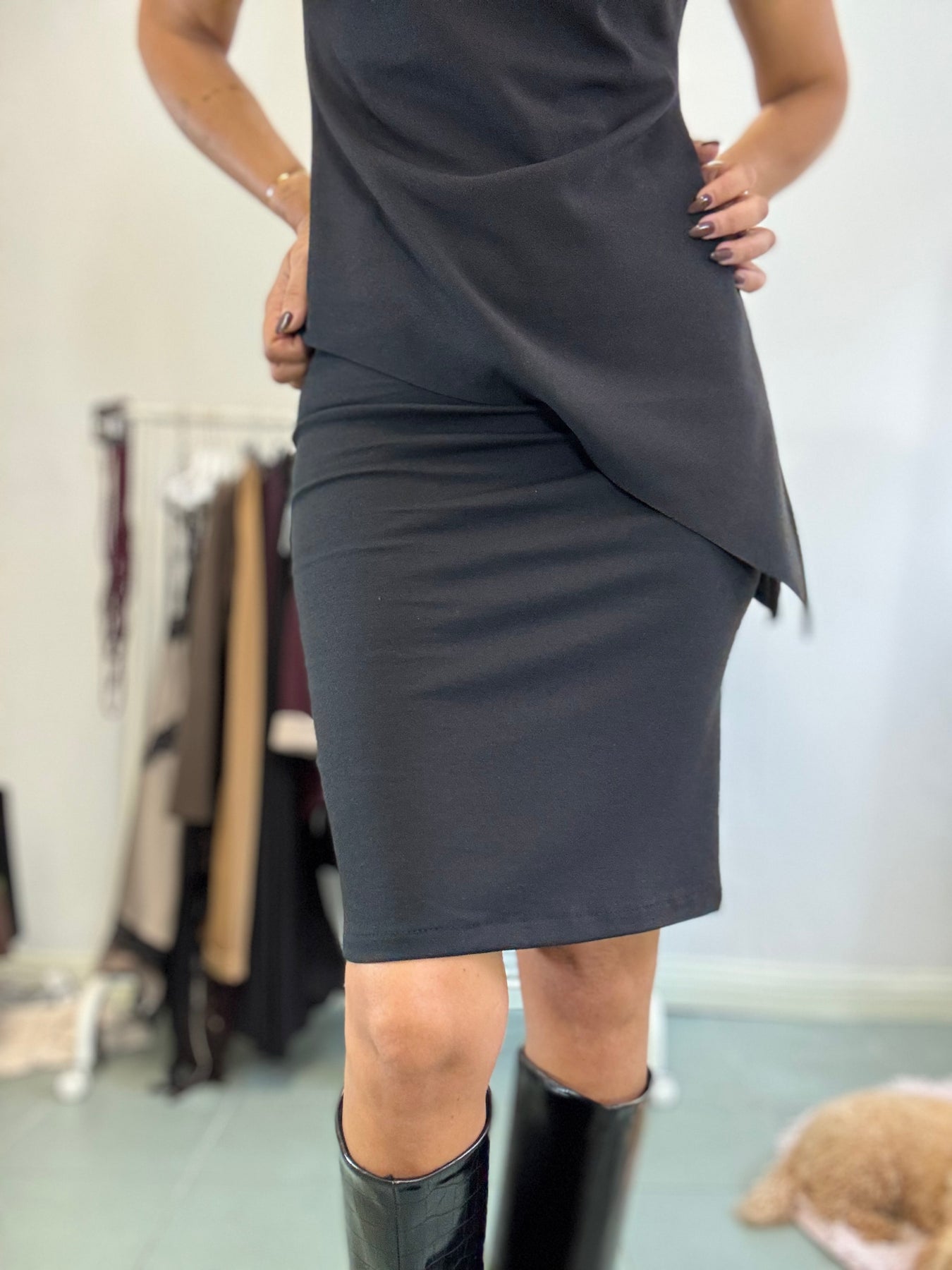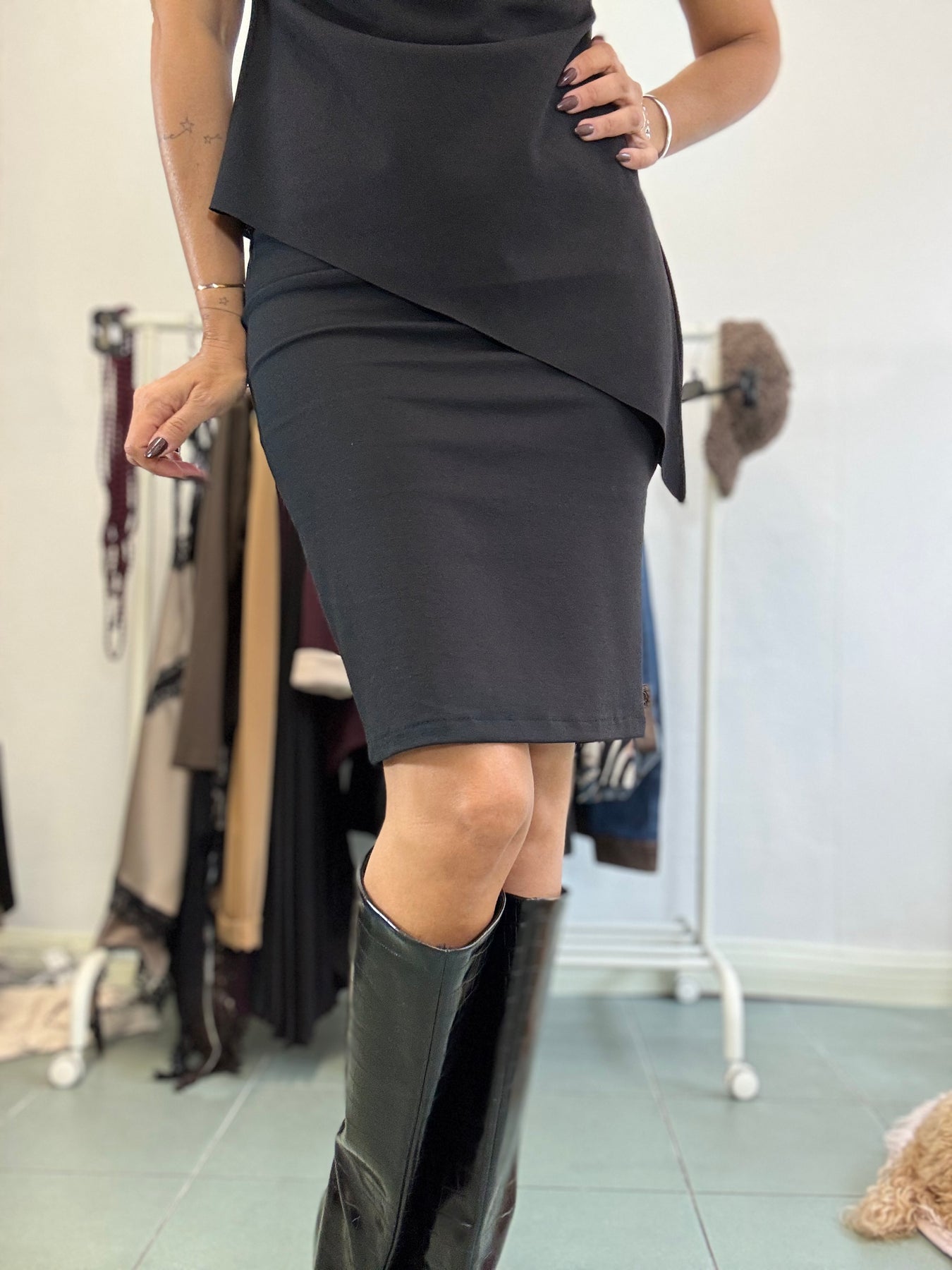 Gonna tubino elasticizzata con spacco posteriore, si chiude con la zip sempre posteriormente, elasticizzata molto bella da indossare sia per un look casual con stivaloni alti che per una serata un pochino più formale. Veste regolare. La modella indossa la taglia S ed è alta 1.74.