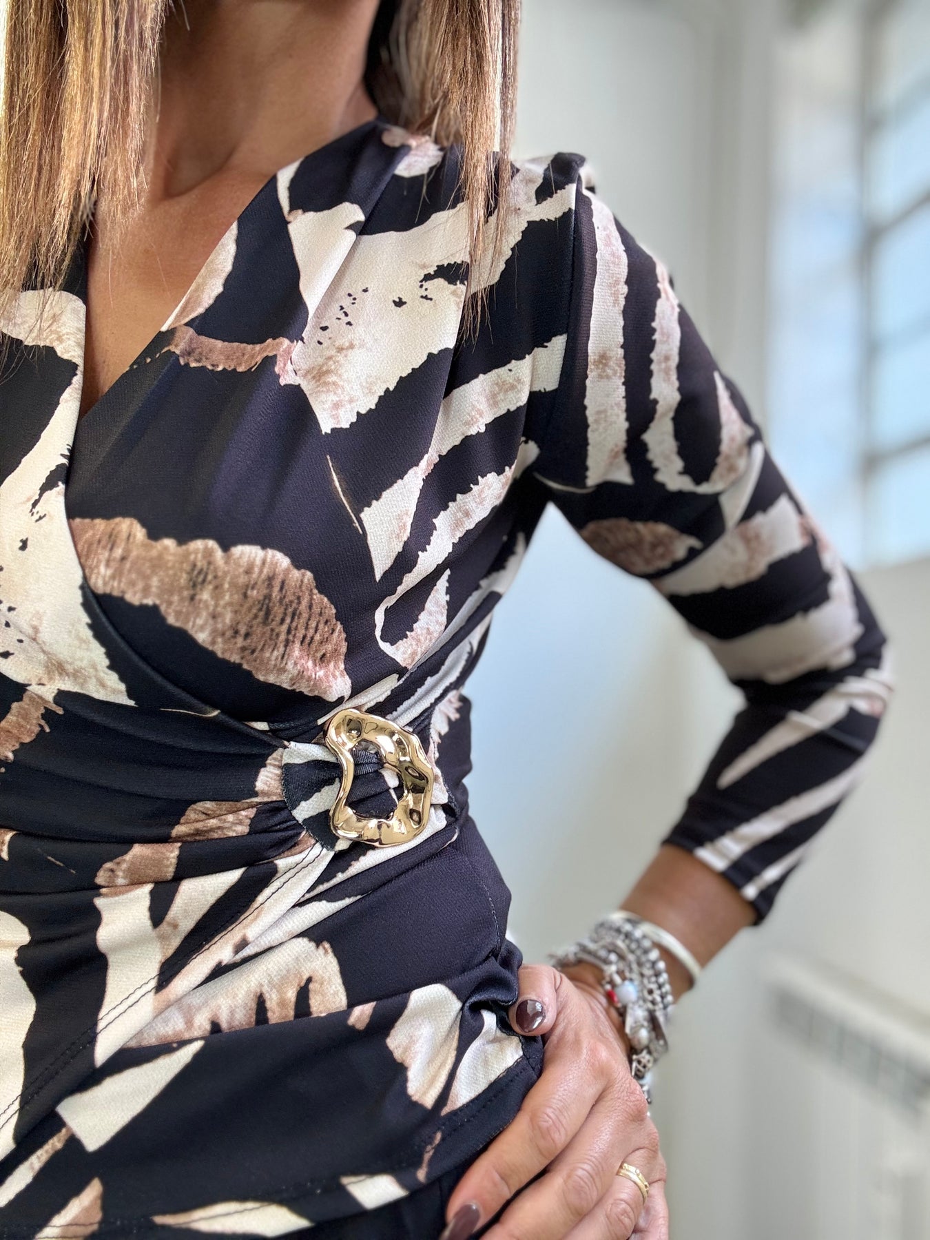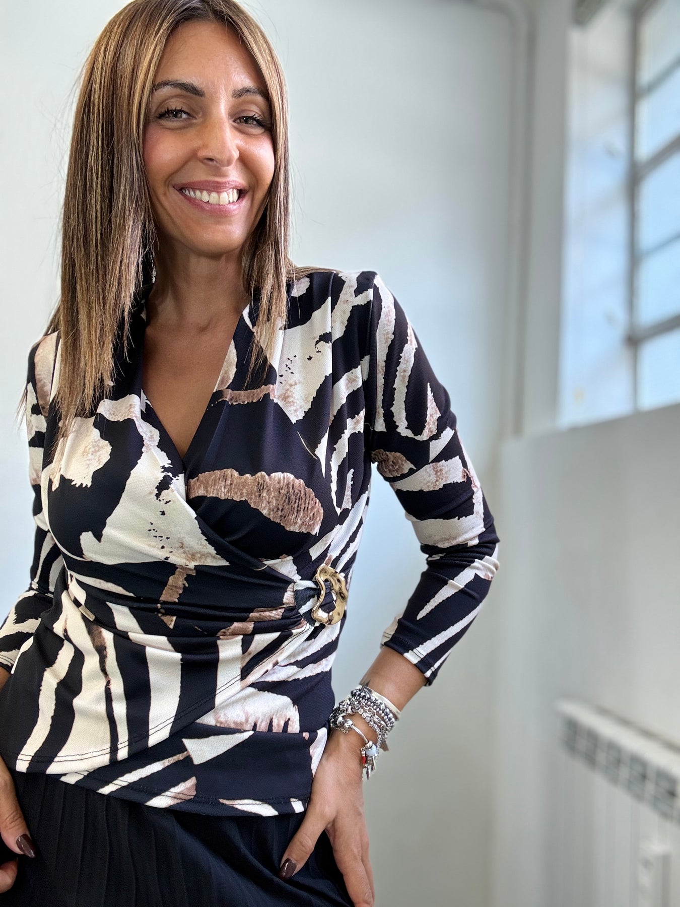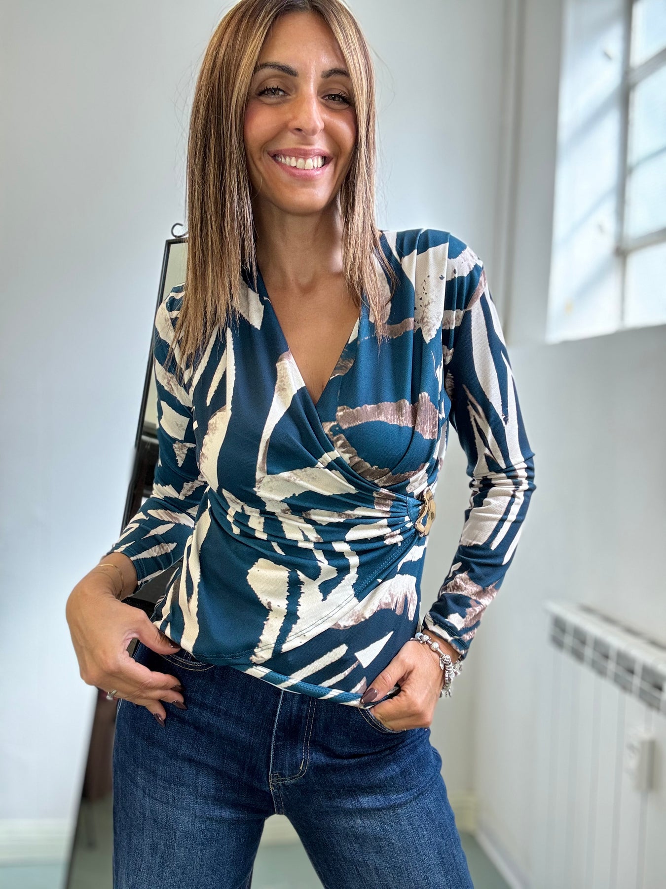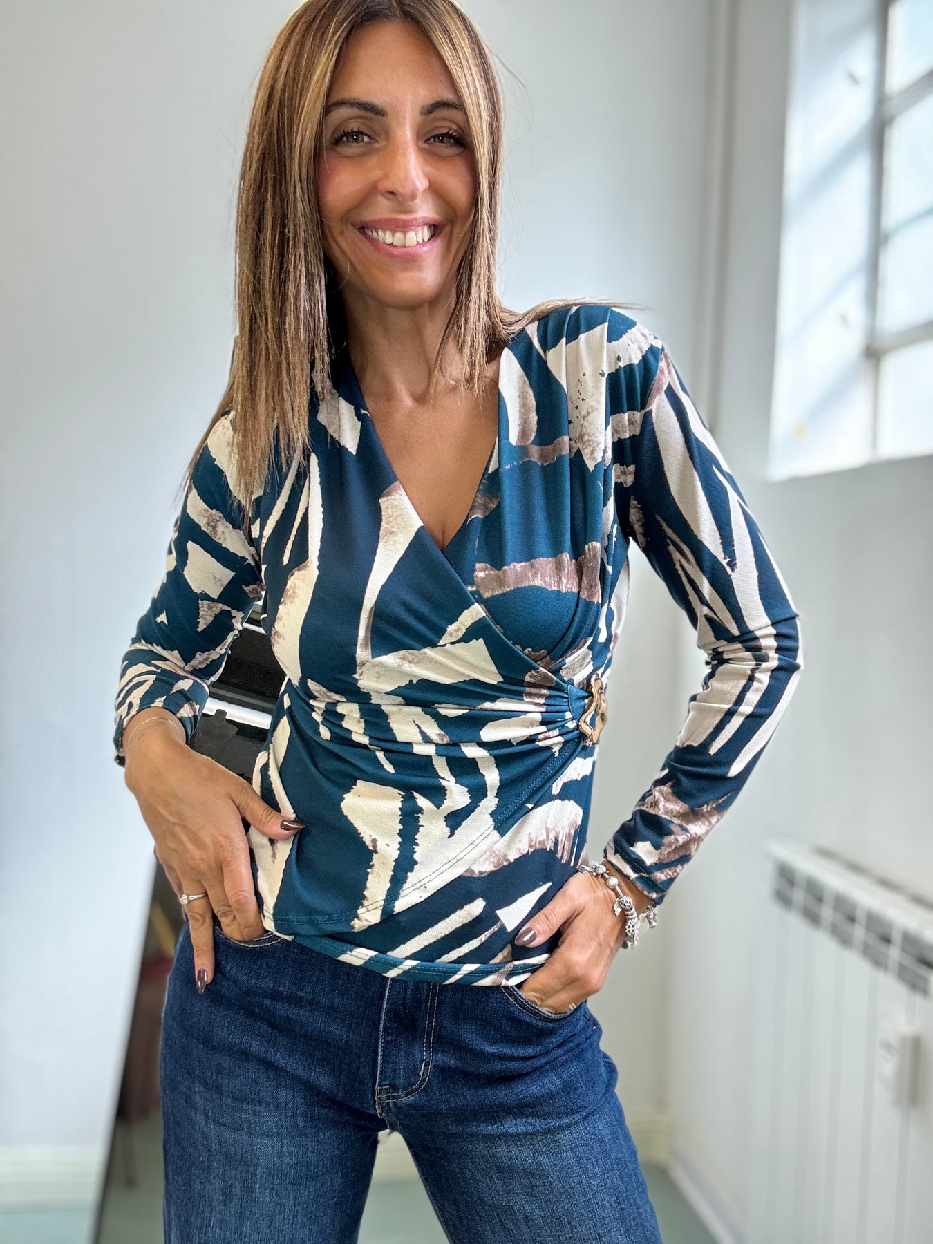 Blusa elasticizzata con scollo incrociato , taglia unica . Dettaglio gioiello solo decorativi.