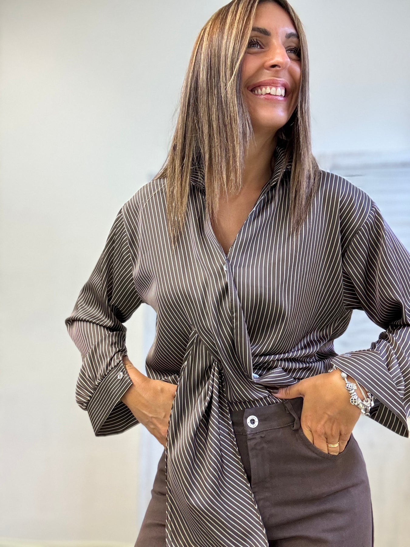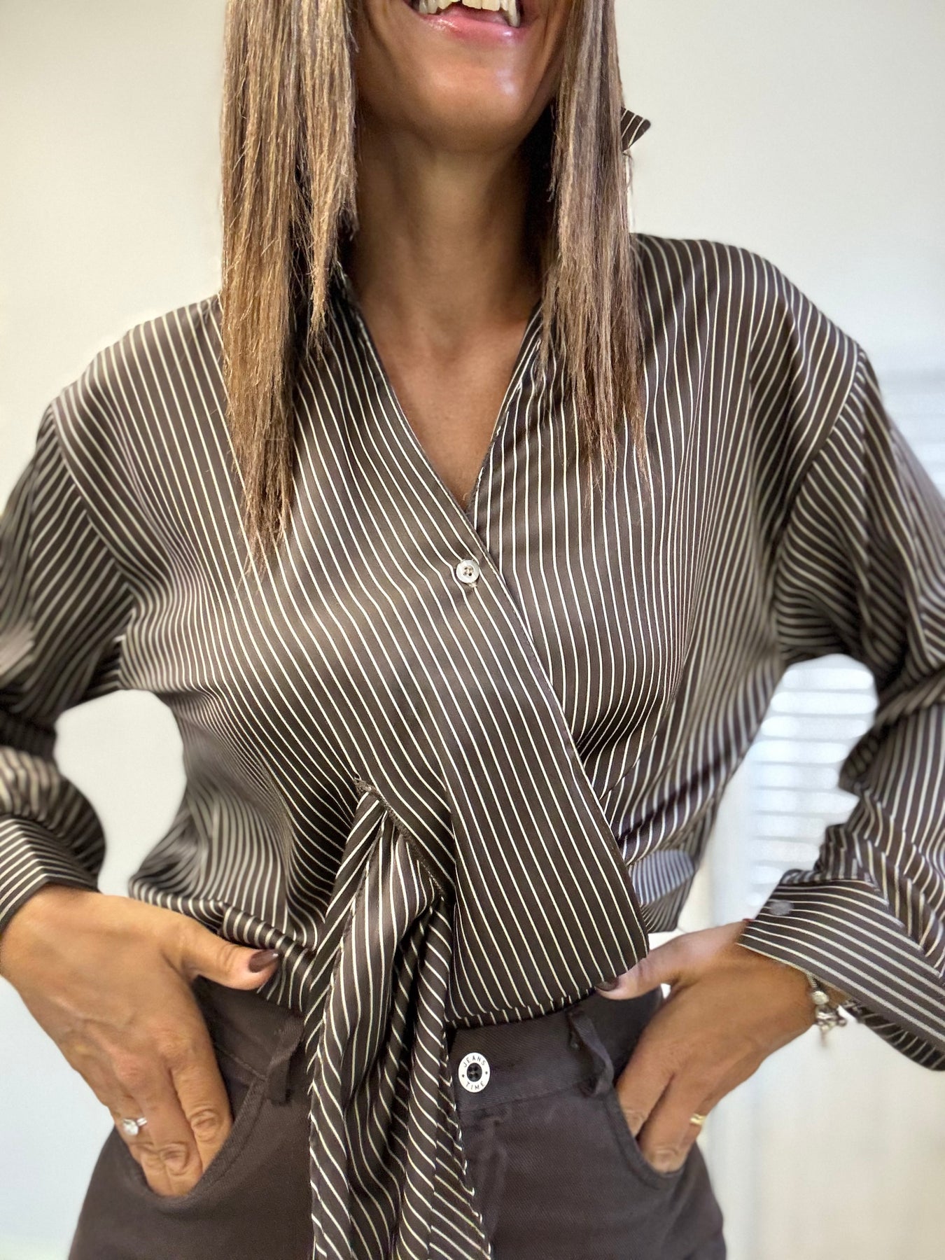 Camicia a righe in raso super virale ! Bella e nuova nella struttura per via della sua chiusura a simil portafoglio. E’ una taglia unica , veste fino alla 44/46