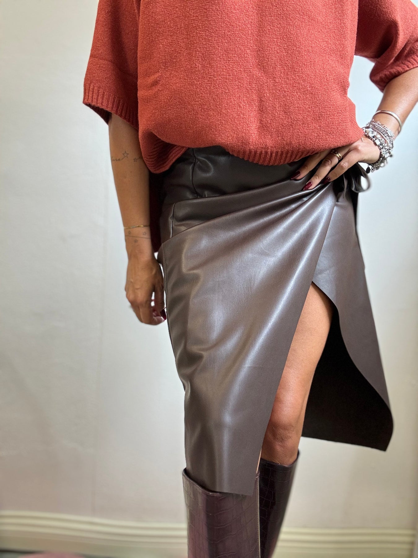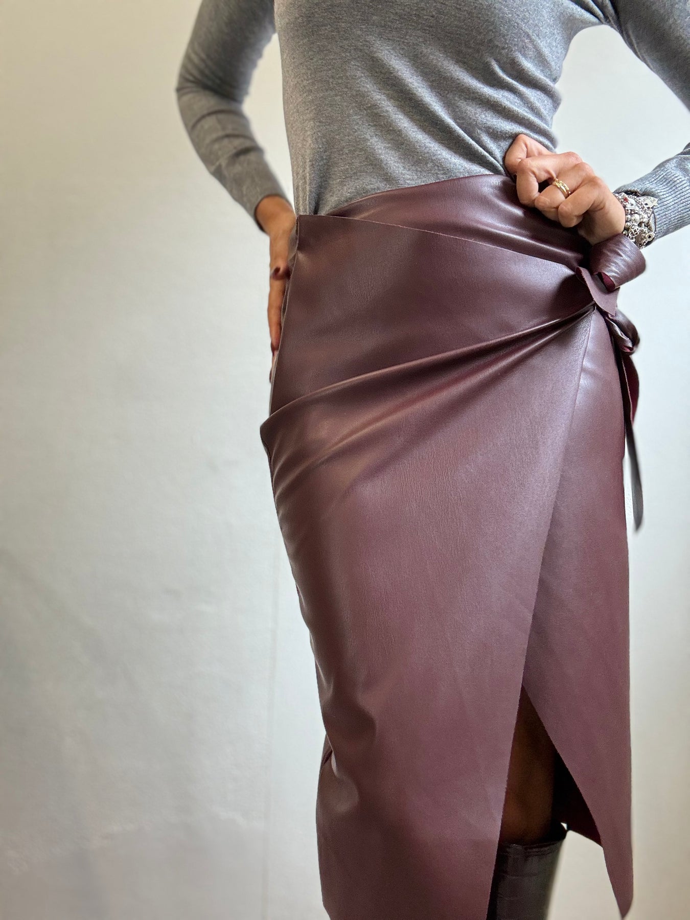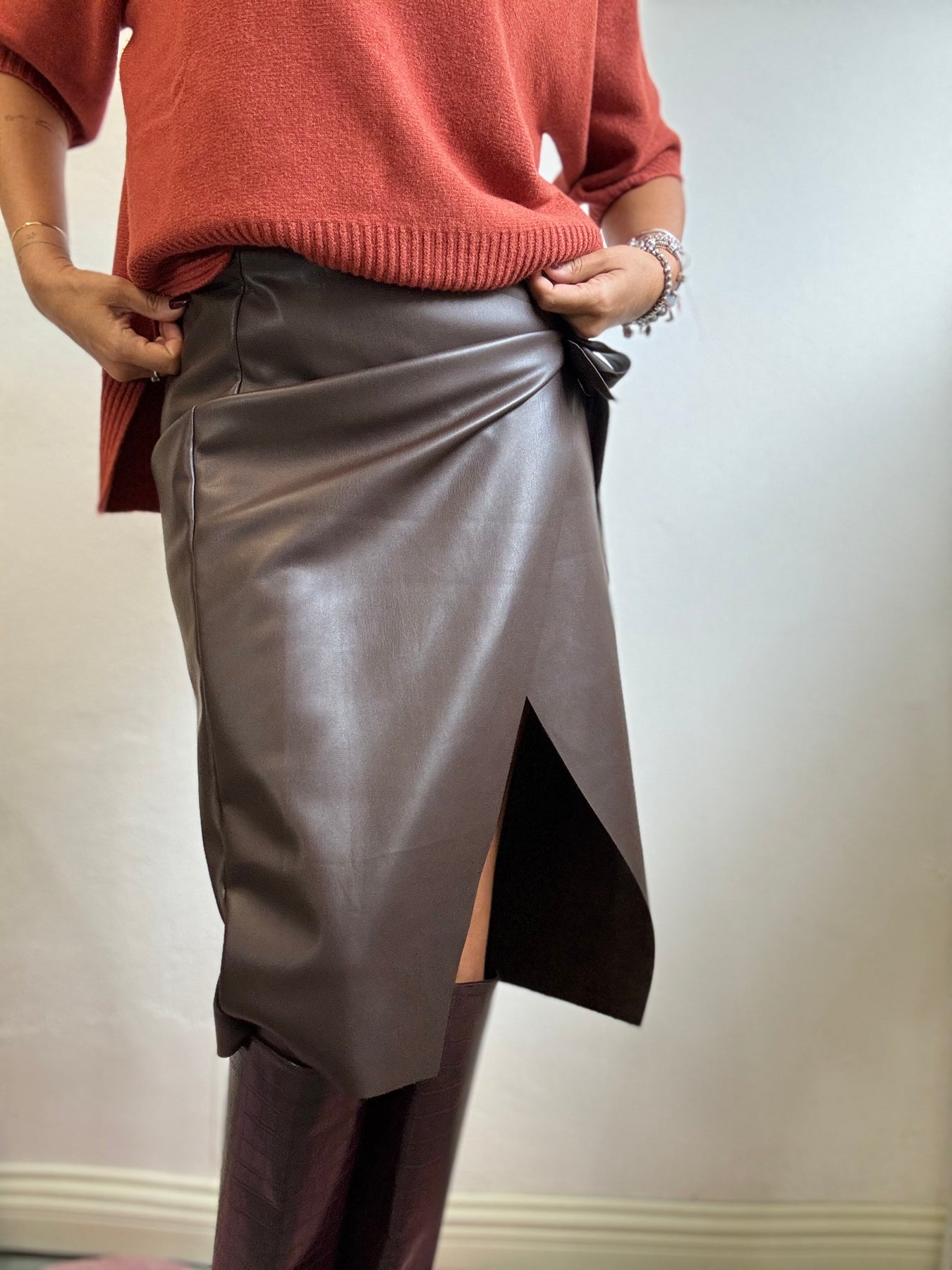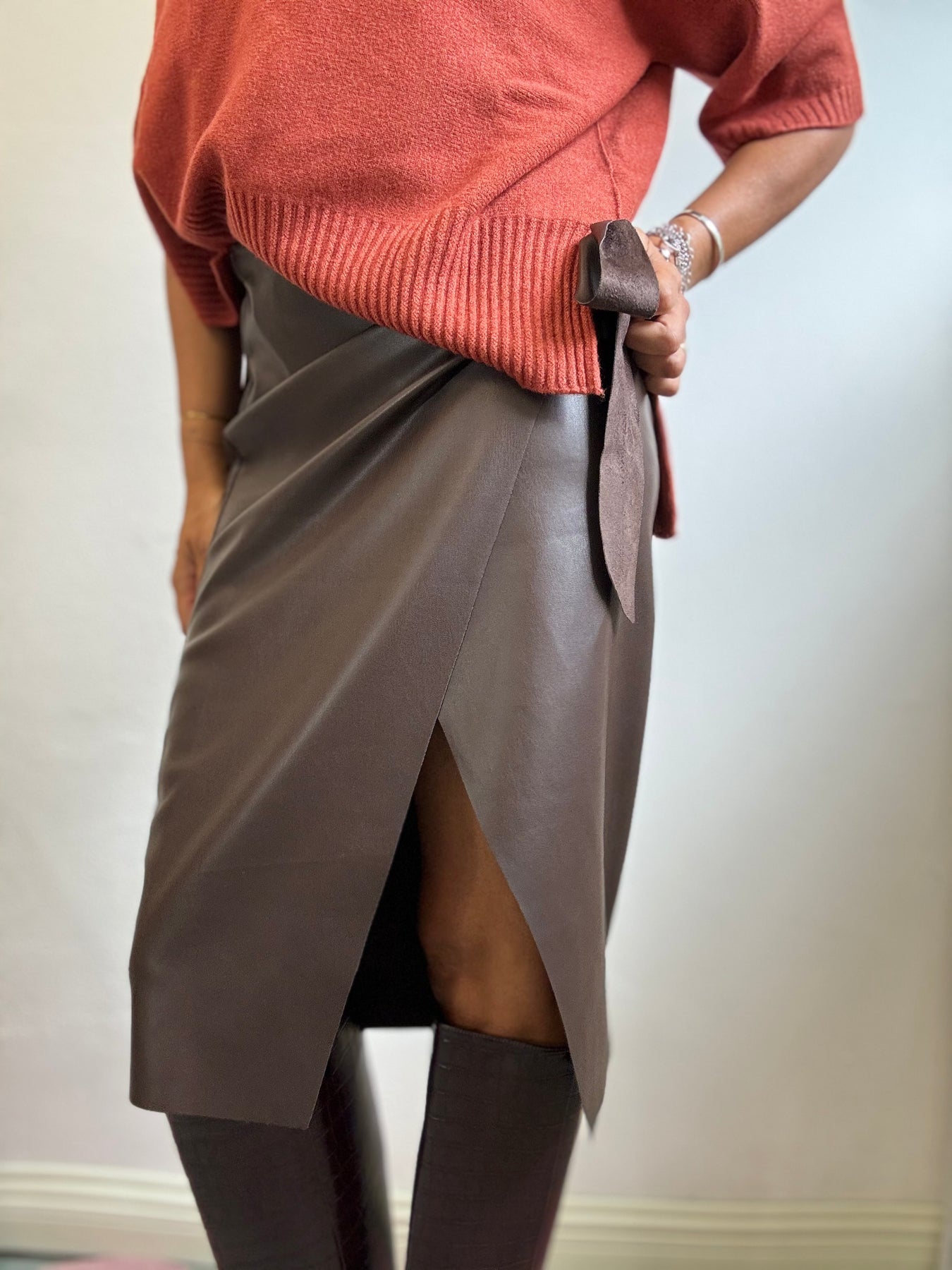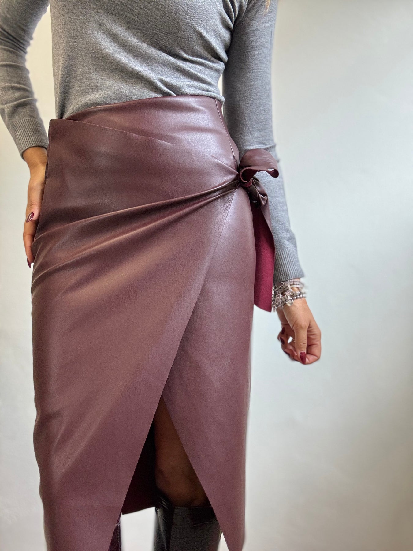Gonna di ecopelle con abbottonatura interna a portafoglio che esterna con un fiocco. Un tubino elegante e femminile , da portare con grande sensualità. La modella è alta 1.74 e veste una taglia S