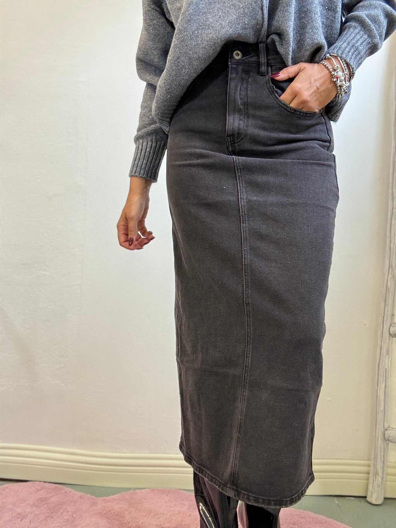 Di grande tendenza la gonna tubino variante denim grigio che ci permette abbinamenti stratosferici. La modella indossa la taglia S ed è alta 1.74